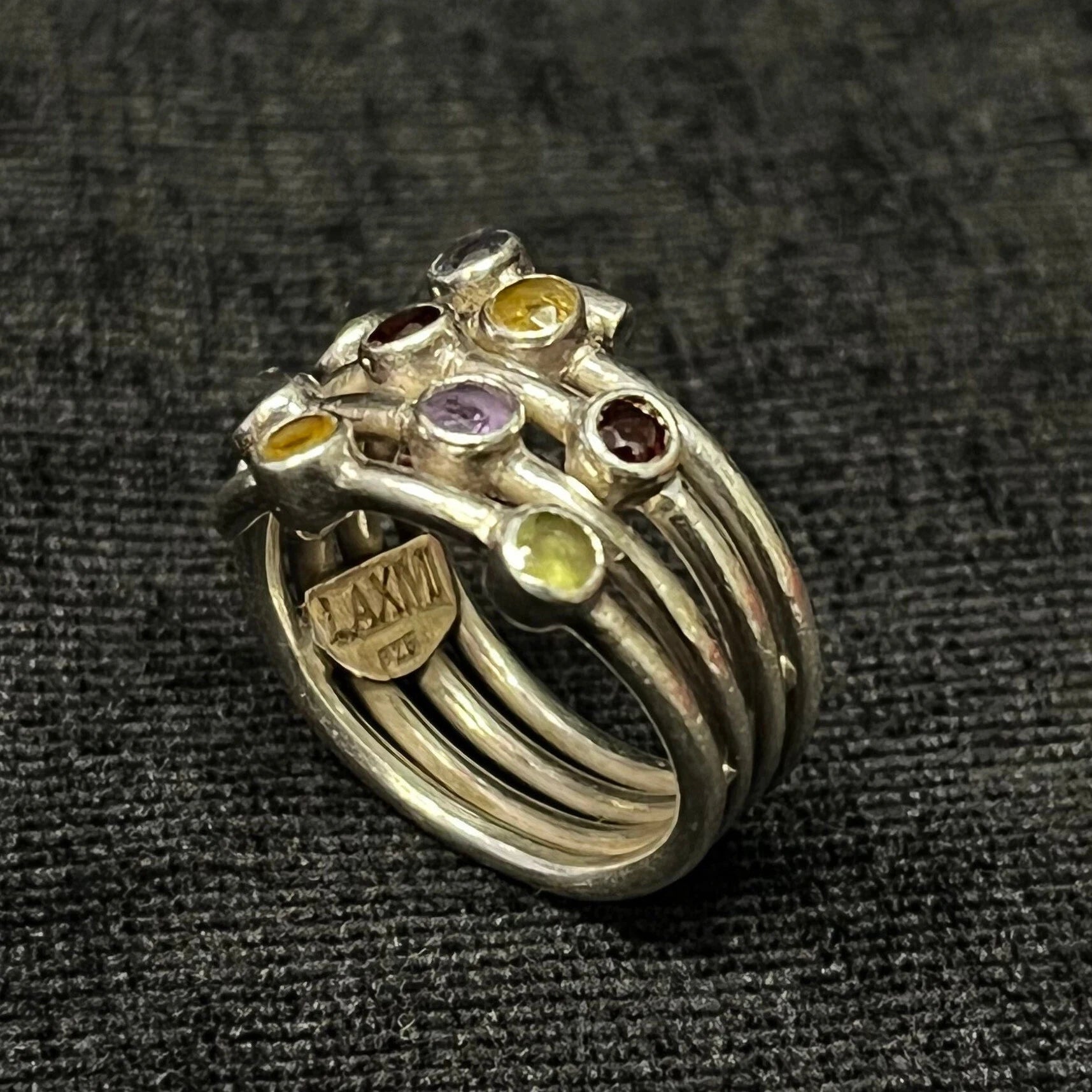 Set with 11 gem stones ranging from: Aquamarine, Amethyst, Rose Quartz, Garnet, Citrine to Smoky Quart, all stones ranging in a spectrum of color, this ring is carefully designed in a simple artistic fashion with a thin spiral band wrapping the finger five times with the stones individually mounted on the top side. The ring is marked "LAXM 925". What a great gift for a grandmother with some Boho style and many grandchildren born in different months.