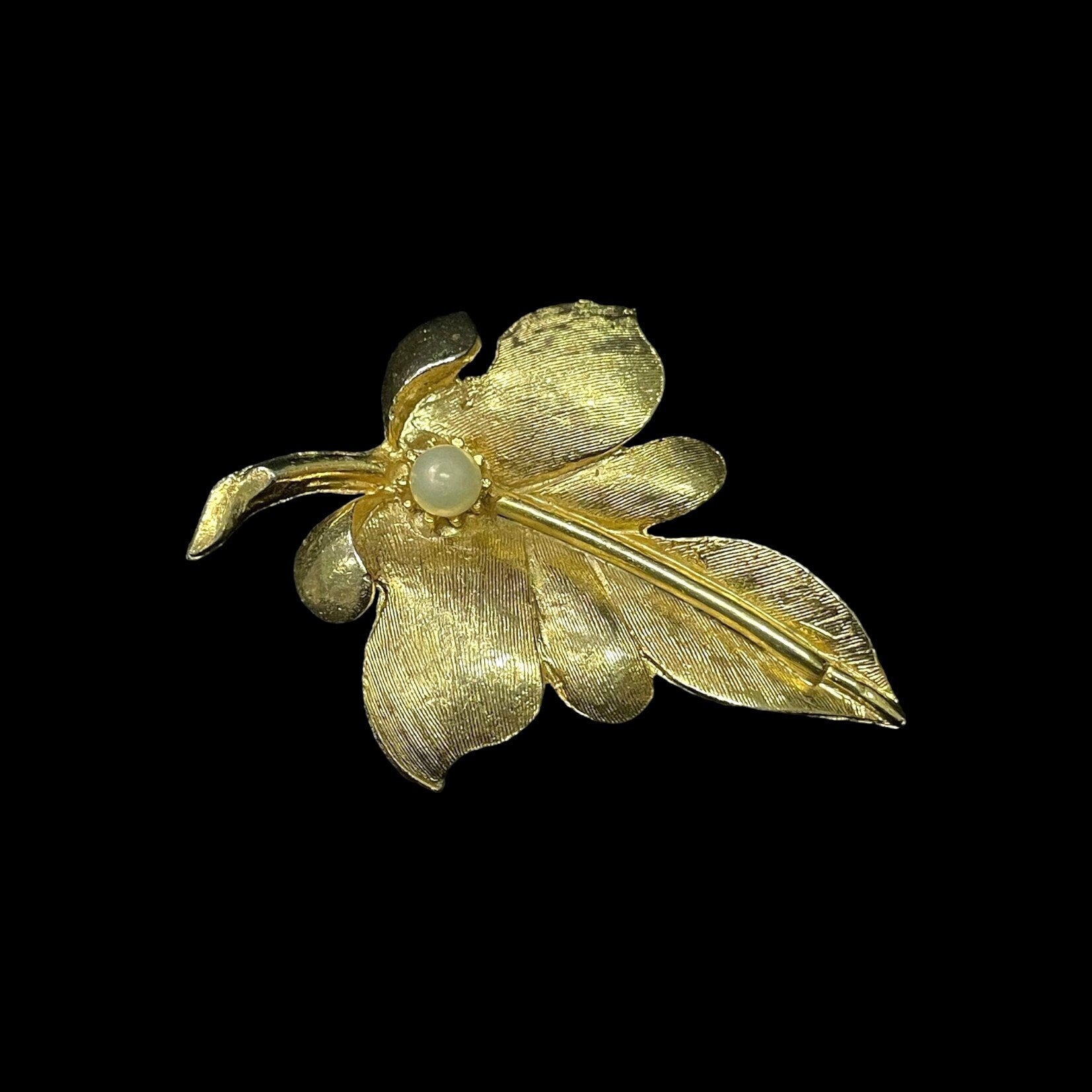 This wonderful golden Leaf Brooch, with a simulated pearl, would be a beautiful gift for a naturalist. The workmanship on the carving was done to perfectly resemble the pattern on a leaf, with the securely held pearl in a prong setting. This is a substantial pin; it feels hefty when picked up. It measures about 2.5" long and 2" at it's widest points. It comes in its original packaging and does not appear to have ever been worn. Lovely gift for a mother or grandmother or any woman who loves to garden or nature hike. Would be perfect on a lapel, holding a scarf in place or a hat.