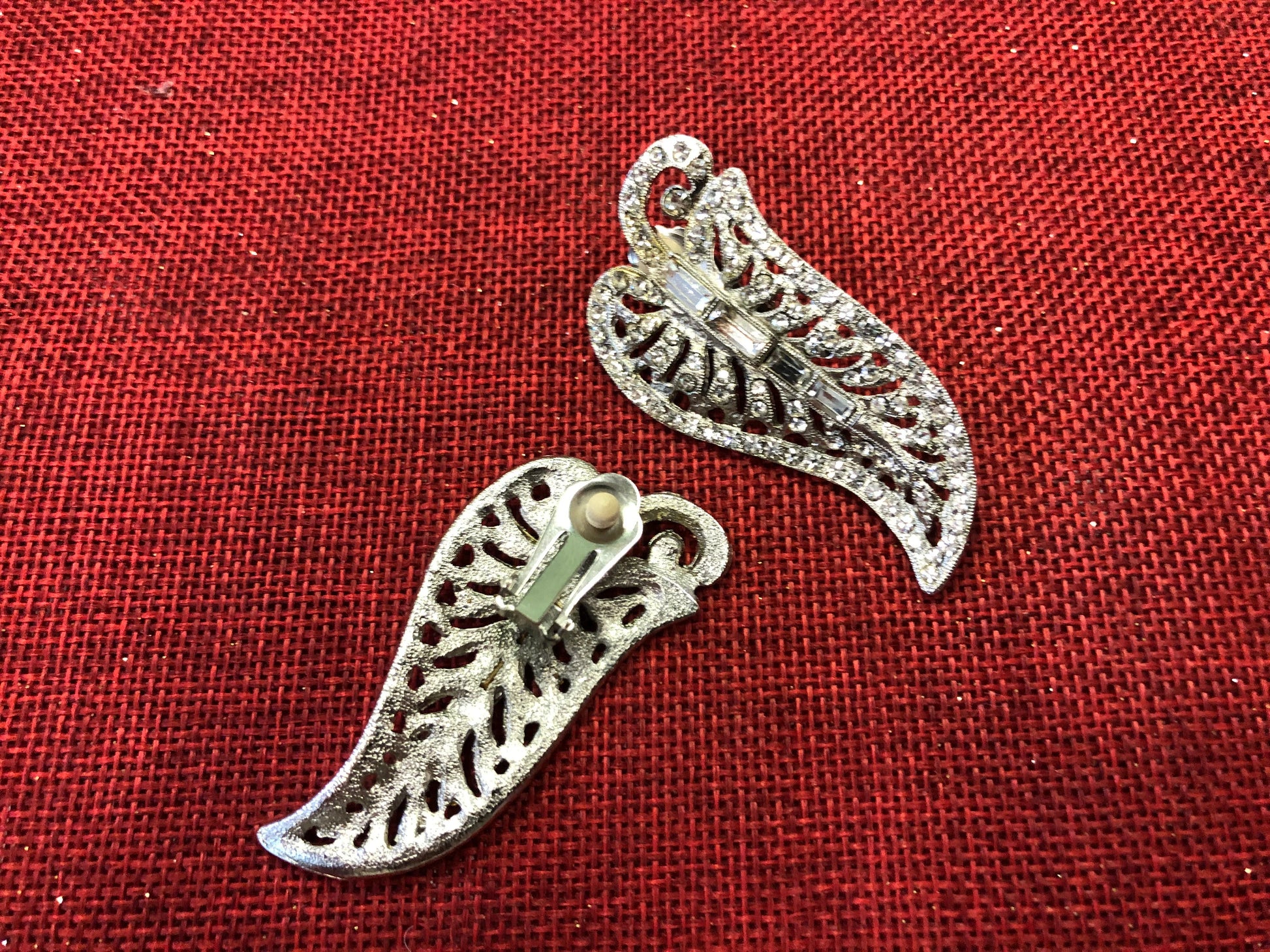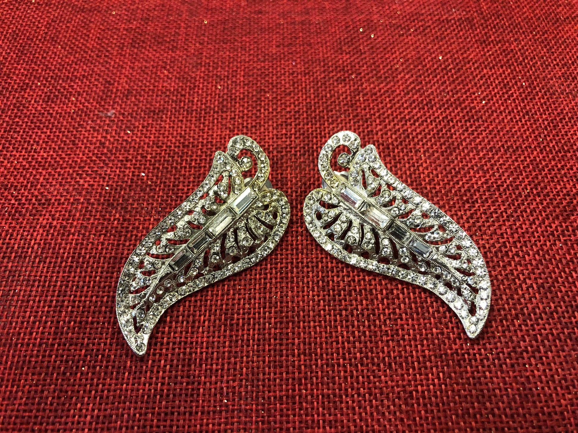 These elegant earrings are in the shape of a leaf with baguette and cabochon crystals. They are clip-on, and therefore can be worn by someone with or without their ears pierced. They bring a shine that you want from an accent piece. They are a great addition to a vintage or modern look, and will call for many compliments on your night out.