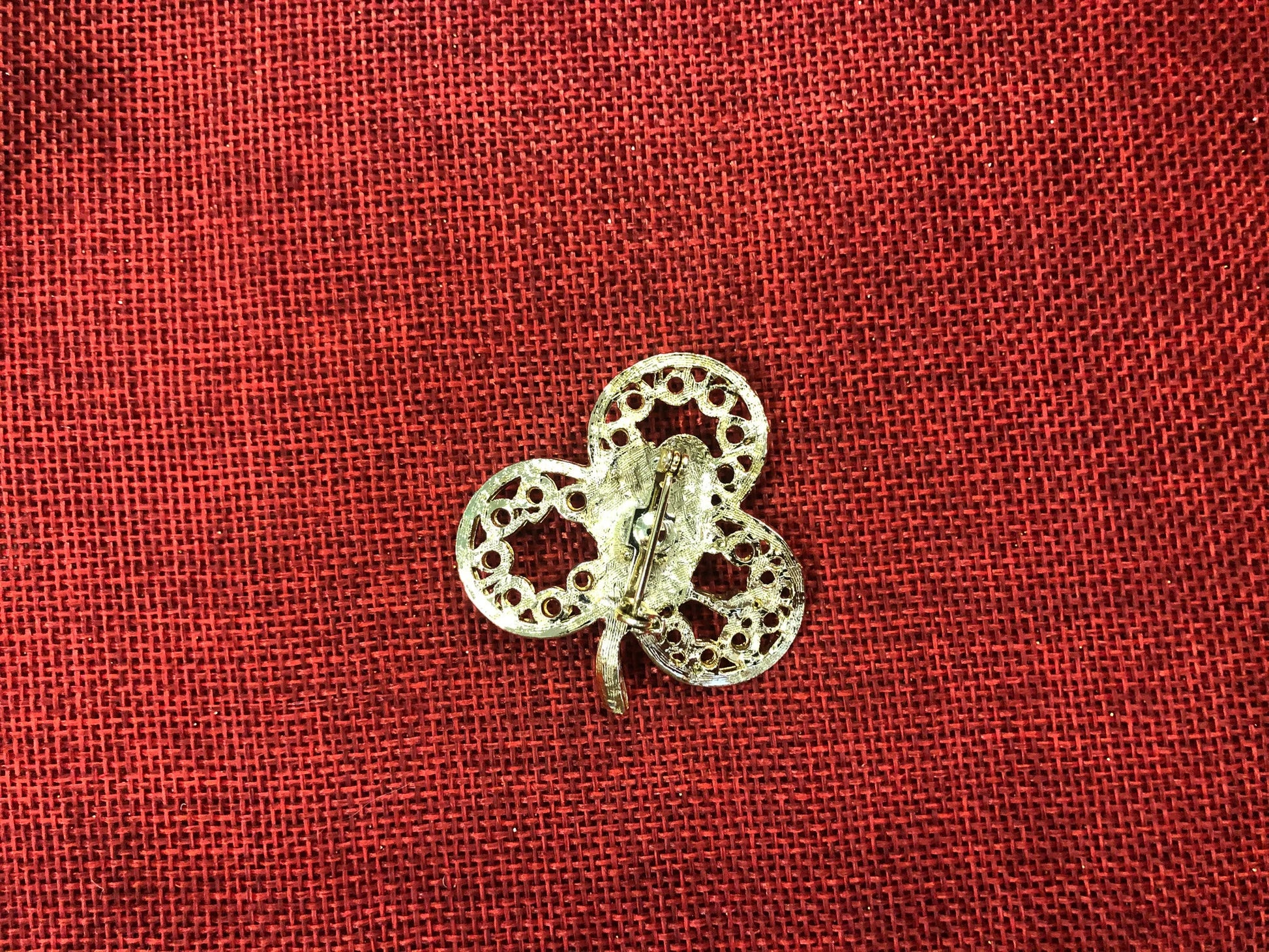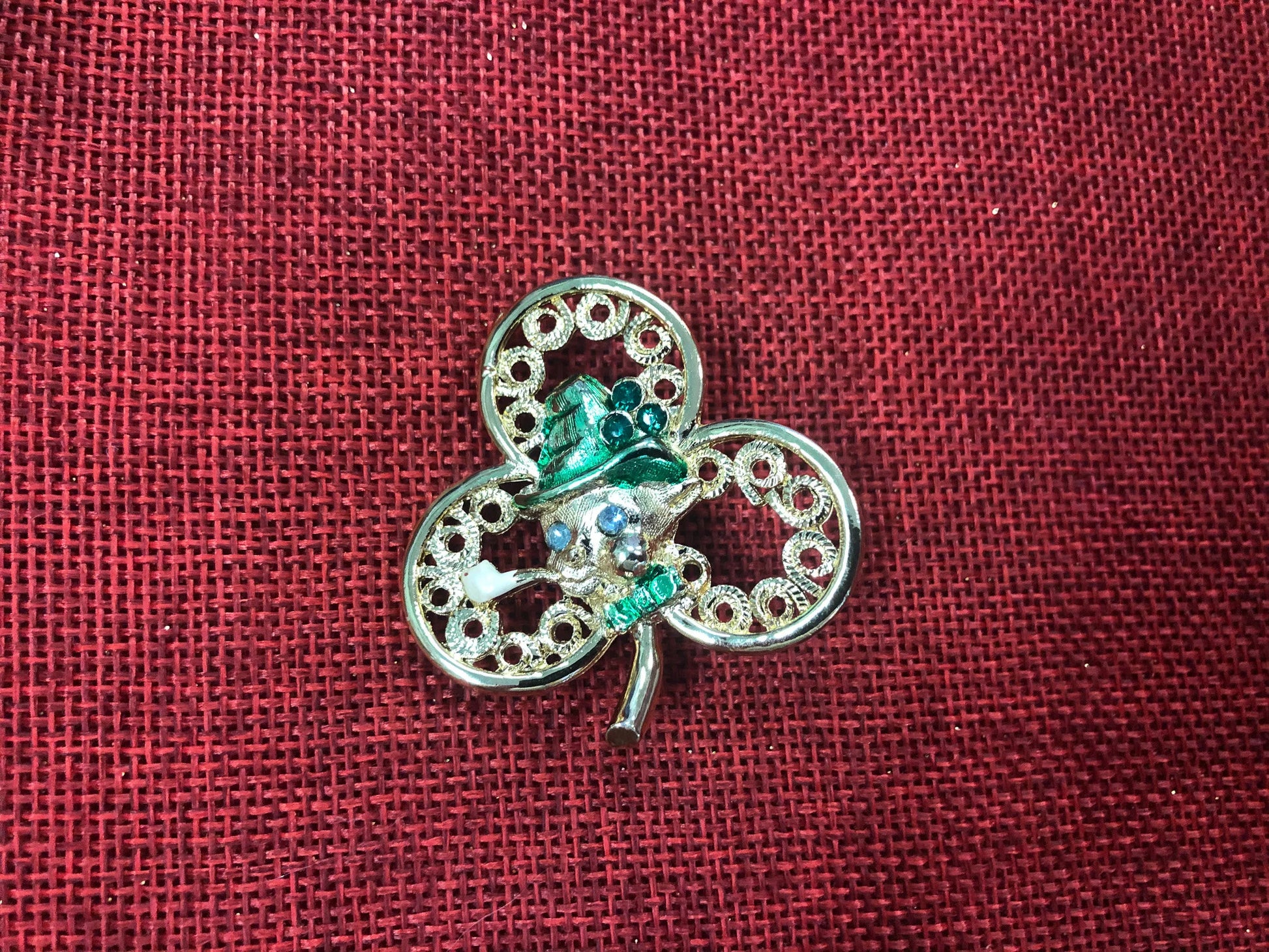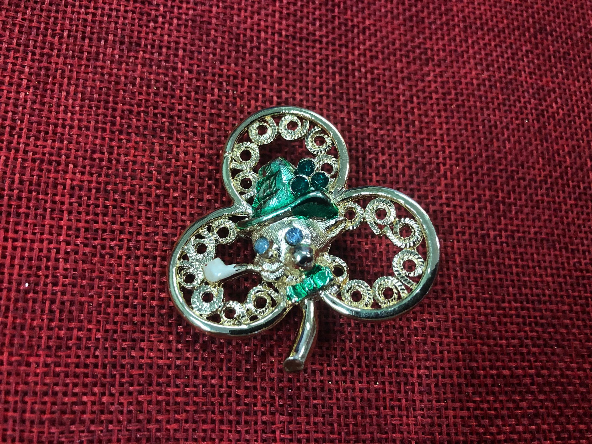 This gold and emerald Irish pin is surrounded by a three leaf clover. The leprechaun sports a green hat with three rhinestones and bright blue sparkling eyes.