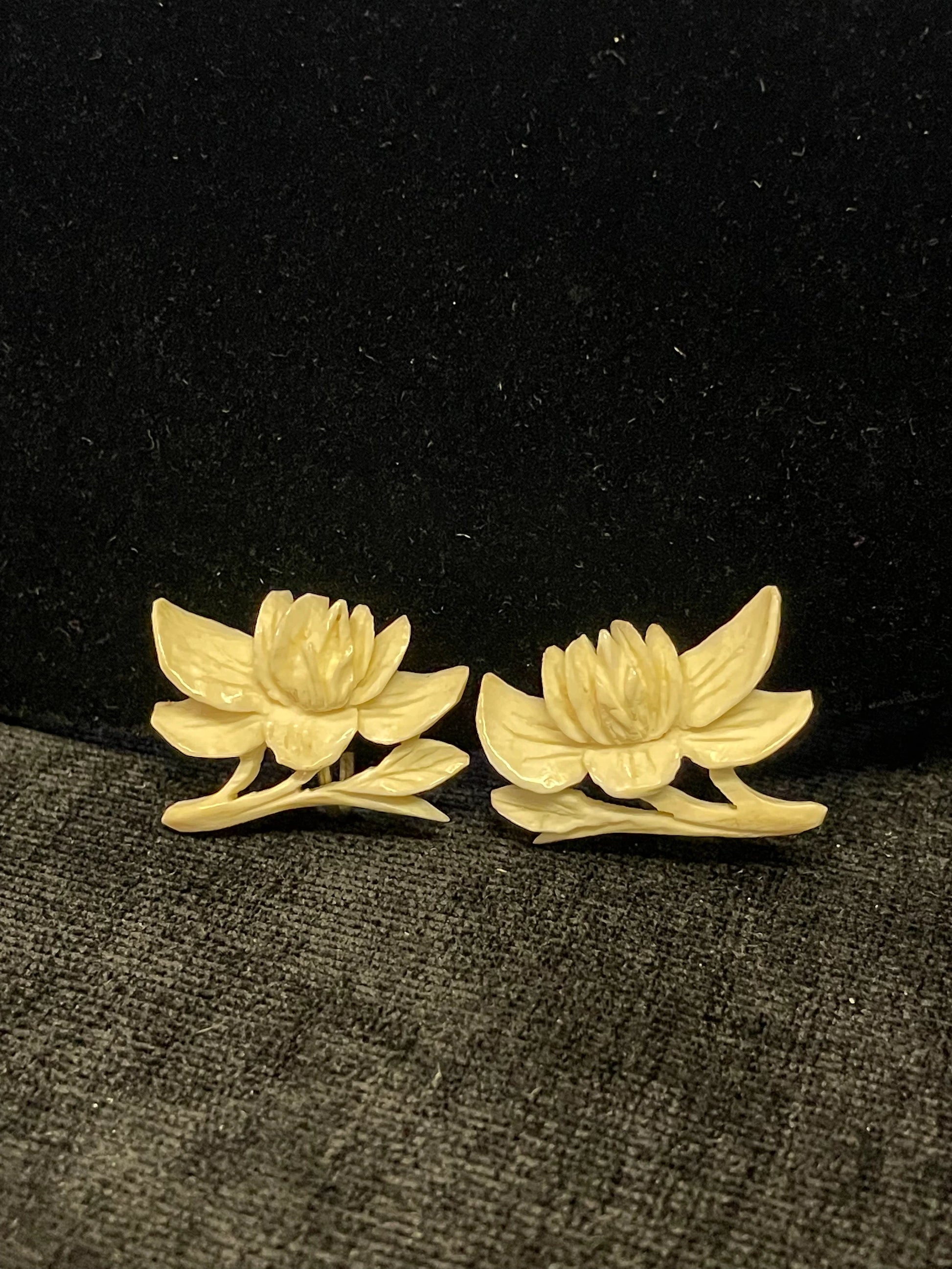 A wonderful set of clip on earrings form the 1930s, and likely purchase in Japan by tourists. These earrings, hand carved from bone are so beautiful. They would be stunning with any outfit, whether casual or chic. The perfect compliment to a little black dress. The Lotus flower symbolizes enlightenment and purity in Japan, and often grows in the summer from the murky water of ponds located near temples.