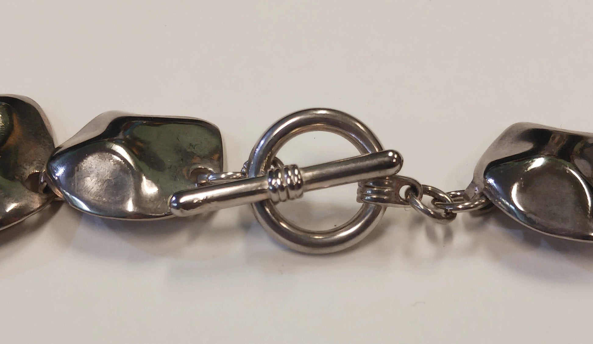 This bold, but fashionable statement necklace is adorned with hammered metal plates with a turtle shell appearance. This chunky turtle shell look is consistent with some of the early Brutalist Modern jewelry made by the jewelry companies trying to mock the more severe handmade Brutalist pieces, which were popular in the 1960s-70s. The necklace hangs 9" long when clasped, and is 18" when laid out, see photos. This necklace is in good condition with only slight wear (see photos). It can safely be cleaned with a little toothpaste and a soft toothbrush, then rinsed with warm water and dried with a soft cloth. It would look great with a black or denim shirt.
