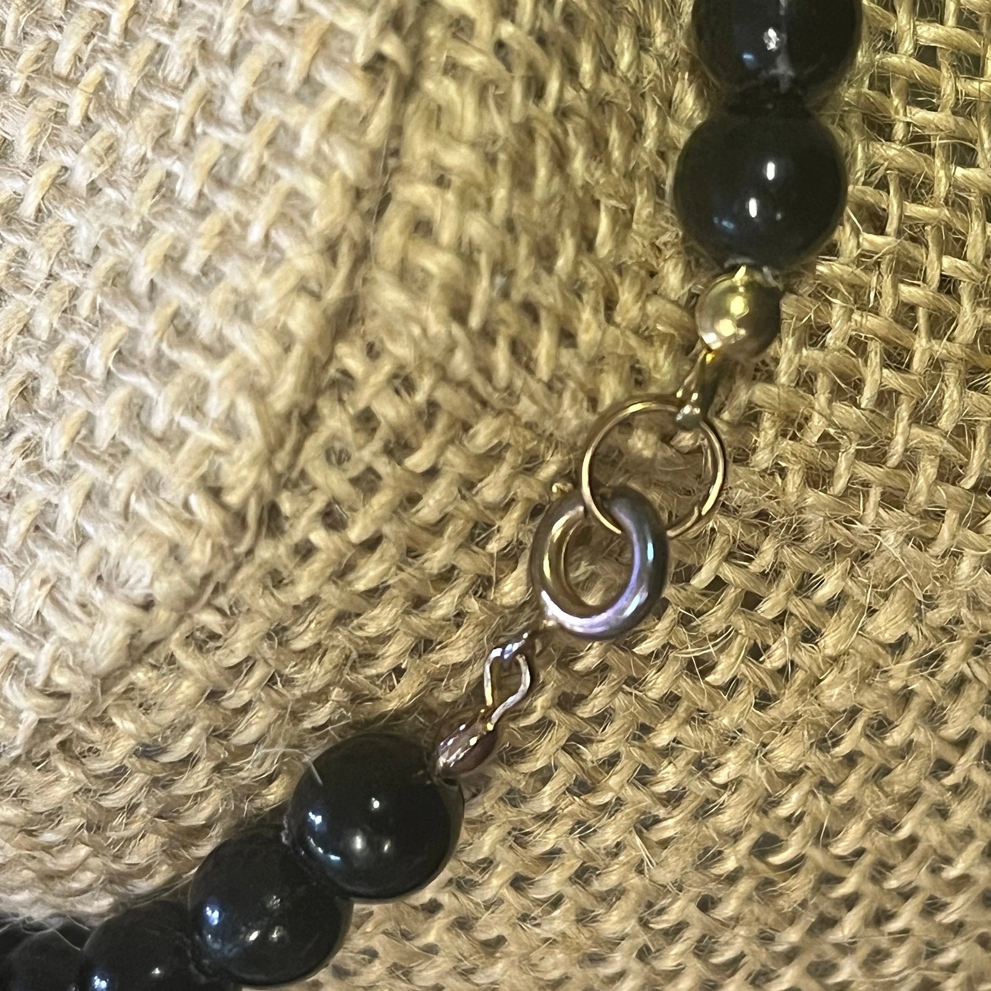 Can you believe this necklace from the 1950s is nearly 75 years old and still has it's original tag on it. The bright mid century look is fantastic and could be worn to dress up a little black dress, or for a fun date night with a white t-shirt. Stroll into Summer with this wonderful beaded necklace tagged "made in Hong Kong". Hong Kong replaced Japan, as the go to place for production of plastic toys, household items, jewelry and trinkets after World War II. The beads interchange colors, flat large paddle beads in red and yellow are separated with black disk and ball beads. Perfect to add a flare to your outfit, this necklace rests at a Princess length.