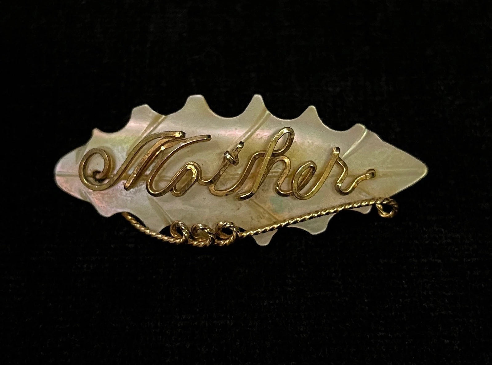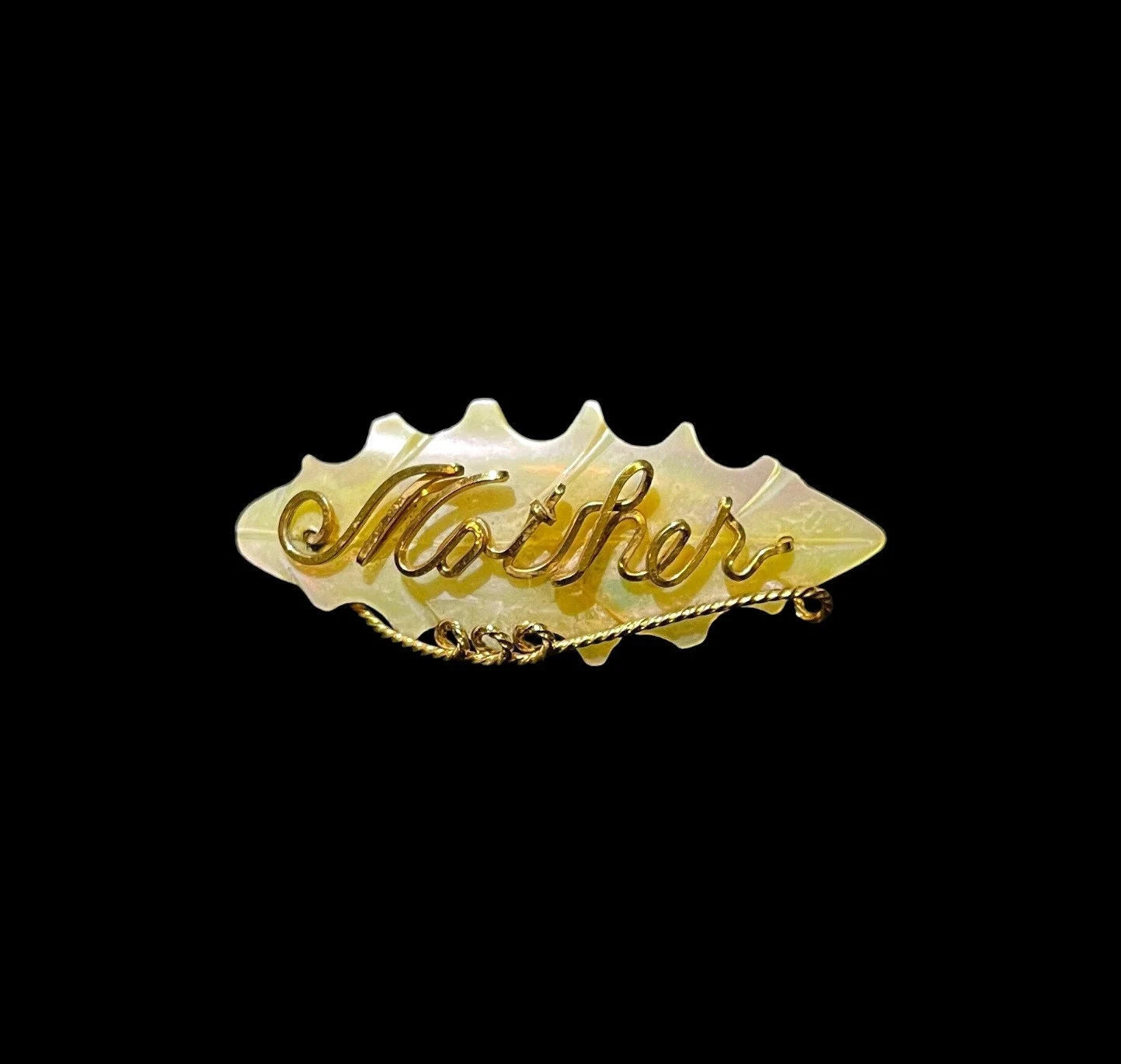 This Mother of pearl brooch With Gold Wire spelling out Mother would be perfect to give for Mother's Day, or to give a brand new mother...or as a birthday gift to a really hard working Mother, who needs some reassurance she is noticed. Made from a beautiful piece of iridescent mother of pearl, the scripted brass spells out Mother. 1.75 " long