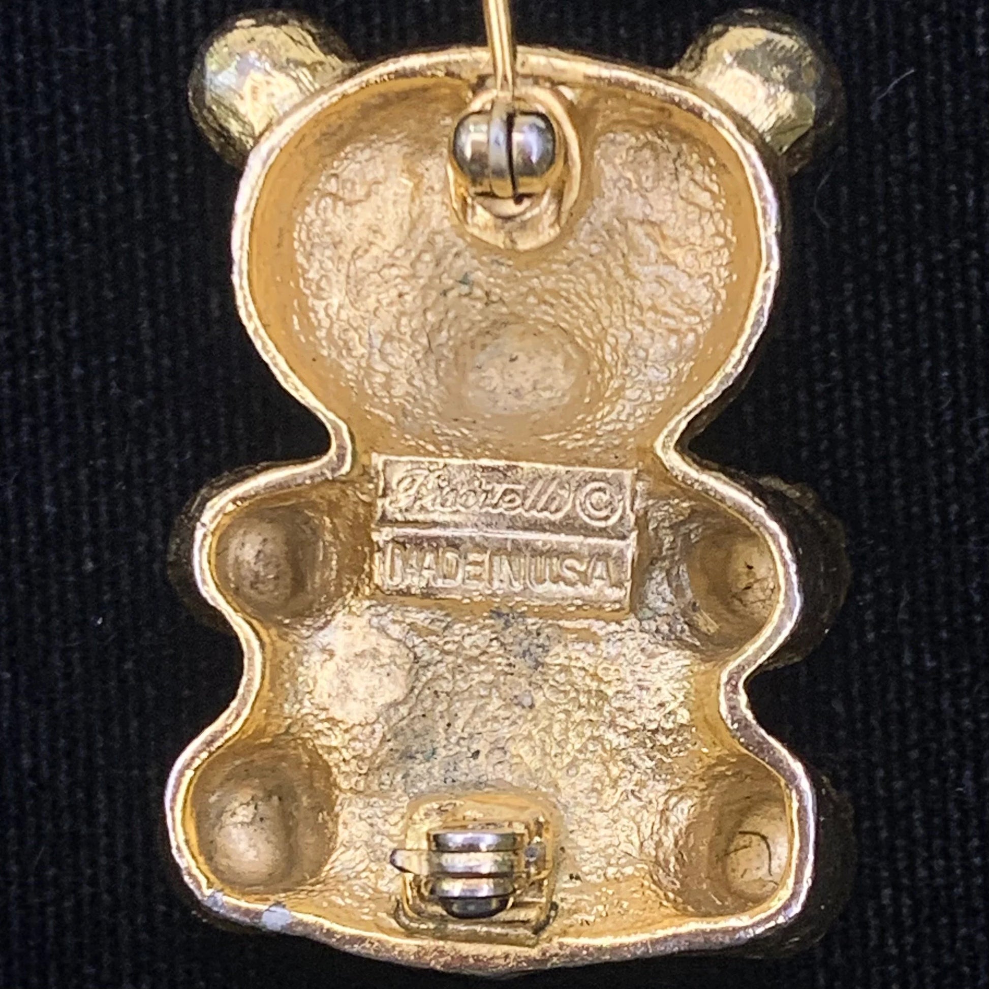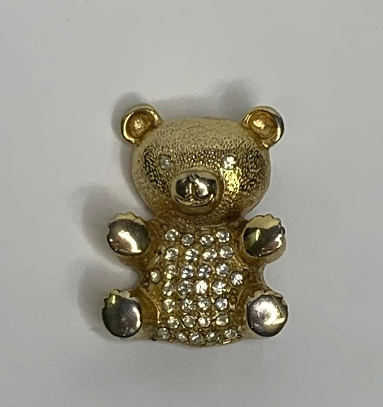 This adorable Piscitelli Teddy Bear Brooch is perfect for a new mother to be. Add a pop of sparkle to her baby shower attire. The 32 Austrian crystals give the beautiful gold tone a sense of luxury. This piece is in great condition and ready to be a perfect gift to treasure.