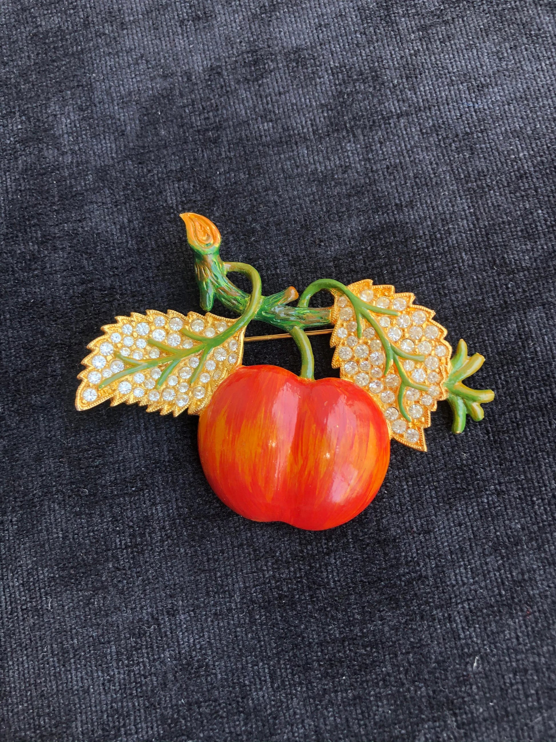 This rare Albert Weiss apple brooch is a stunning piece of work. It features a colorful hand painted enameled apple and branch, which are adorned with two accenting gold leaves. The bright gold leaves are textured and covered with clear rhinestones, adding a bit of flair to the piece. It dates to around the early late 1940's to early 1950's. This piece is in excellent condition, the metal is still extremely bright, there are no missing rhinestones or spots of missing paint. The apple is beautifully painted, with different shades of orange and red creating a textured look to the fruit. The pin back is strong and straight, and the clasp locks very tightly. This piece would be an absolute treasure to add to your Weiss collection, it is sure to catch anyone's eye.