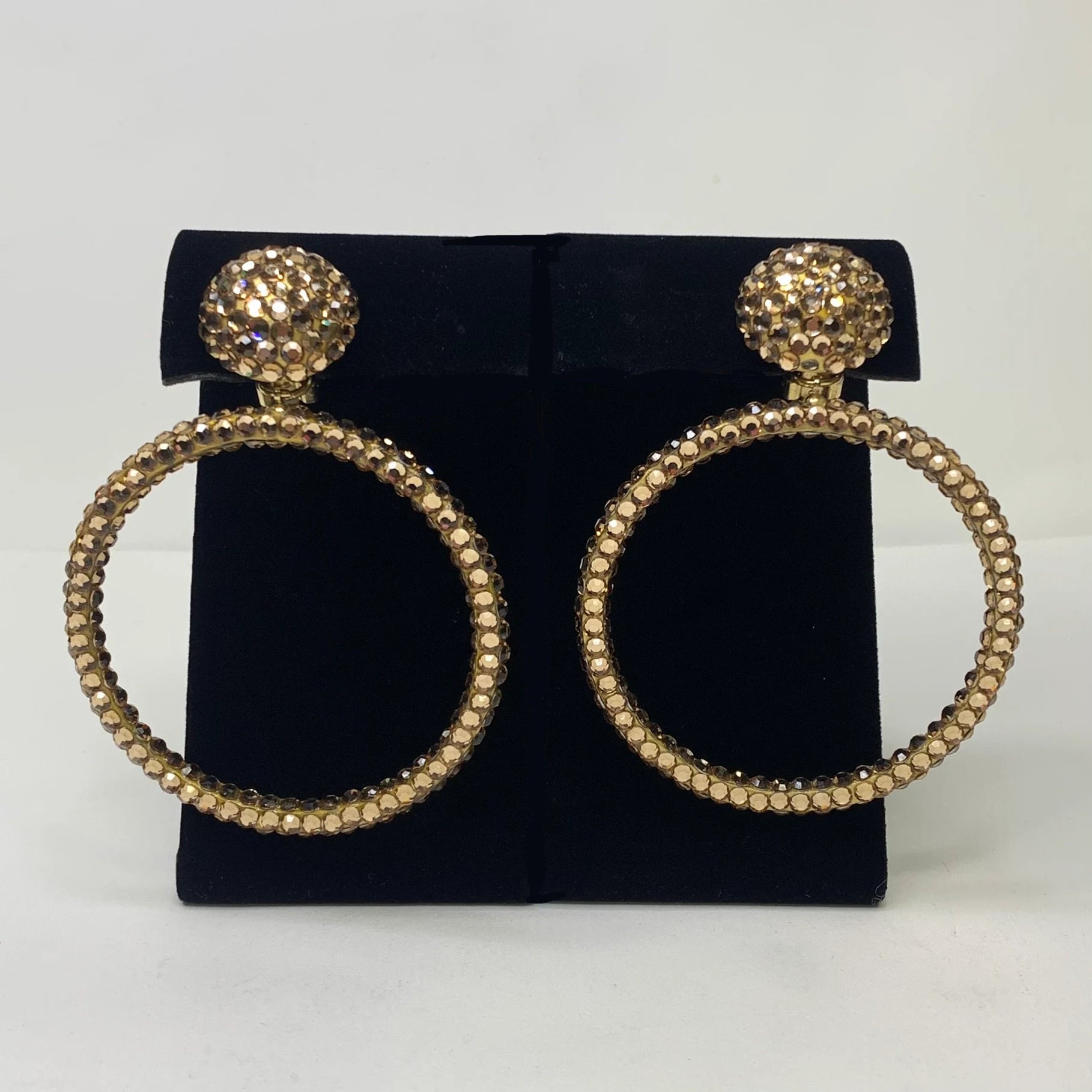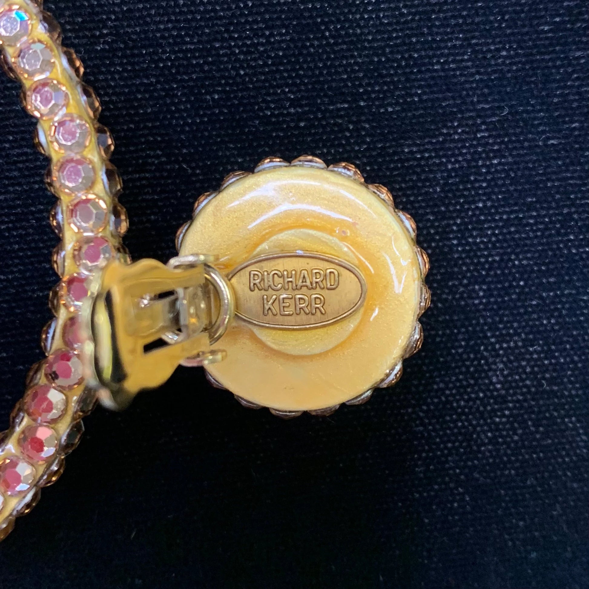 Richard Kerr Earrings for the movie star in you! A stunning round cluster of Gold Rhinestones at the earlobe drops to a large, rather exaggerated circular hoop encrusted with more gold rhinestones, finishing these Kerr Clip-On Earrings.