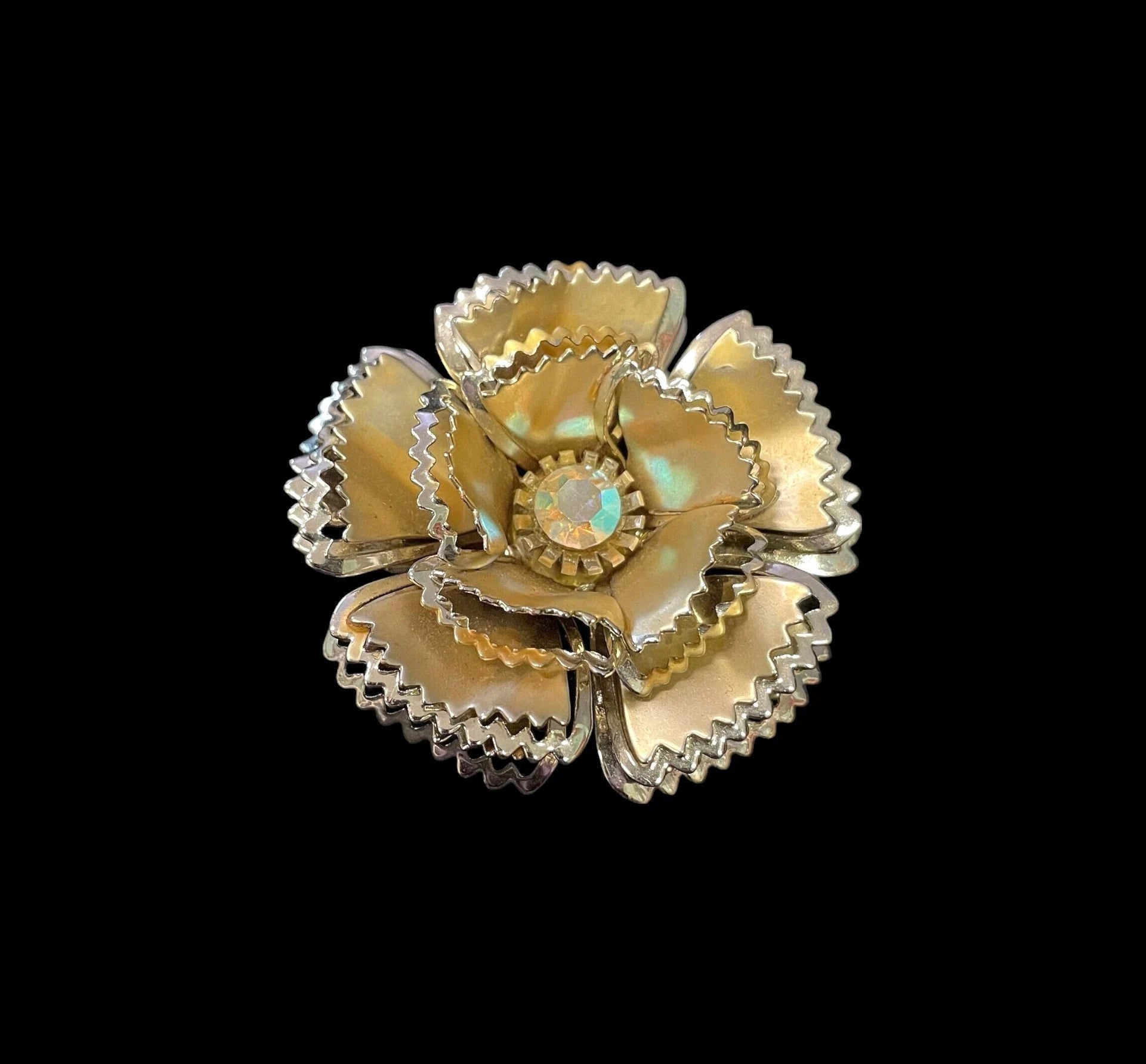 Scalloped Layered Metal Flower Petals with Aurora Borealis Crystal Center - Large Flower Brooch with Aurora Borealis Crystal Rhinestone
