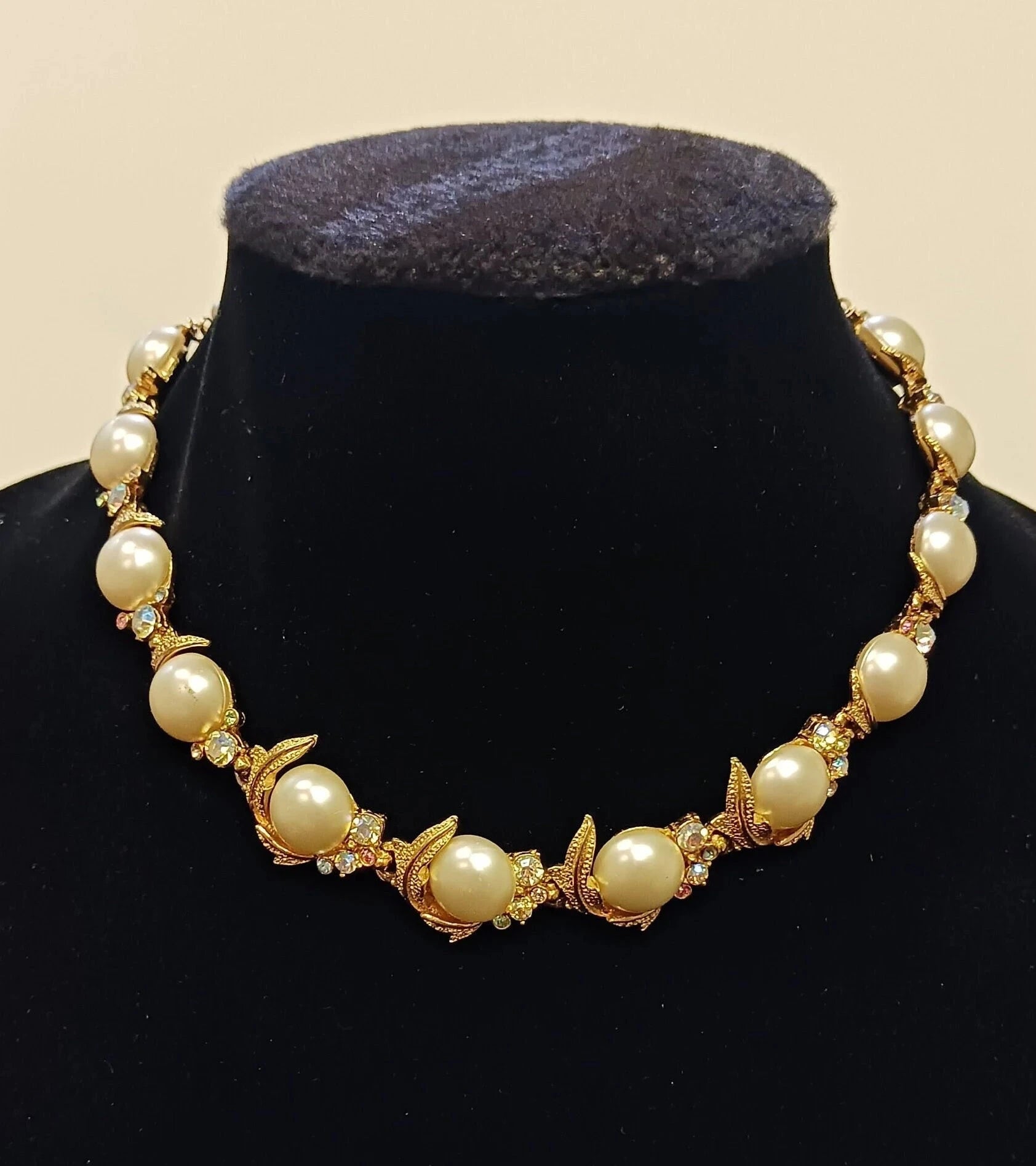 If you've been looking for something to complete that bridal look, or even just to wear out to dinner, this could be the perfect thing. Today we have a beautiful, vintage Mode-Art necklace for sale. The necklace is a 14k gold plated base with gold accents, large faux pearls, and multi-colored rhinestones. The rhinestones alternate between pink, blue, and green along the necklace, with a larger Aurora Borealis style one between each "pearl." The necklace has a simple hook clasp that hangs from a faux pearl dangle. Without the dangle, the necklace measures 10.25in in length, and can be adjusted into choker size, or set to hang more loosely on the neck. The necklace is 100% authentic, and has the "ART" signature on the back (see photos) to signify that it is a piece produced by Arthur Pepper before his company halted production in the 1970s. This necklace is in excellent condition with minimal signs of age - definitely ready to wear!