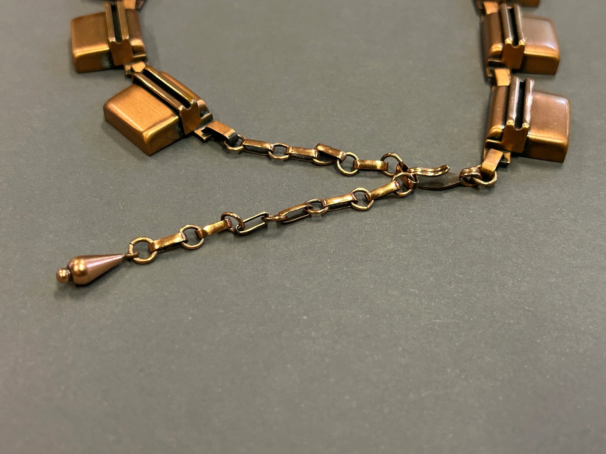 Signed Renoir/Picasso Copper necklace vintage Mid Century Modern. This lovely piece has a hook and chain closure which adjusts the length from 13 inches to 17 inches. The necklace is made up of geometric squares with bars across them. It is signed on the clasp "Renoir". Renoir produced high quality copper jewelry from the mid 1940s to 1964. They were known for employing skilled metal-smiths as their craftsmen to create solid copper jewelry. The jewelry is very timeless