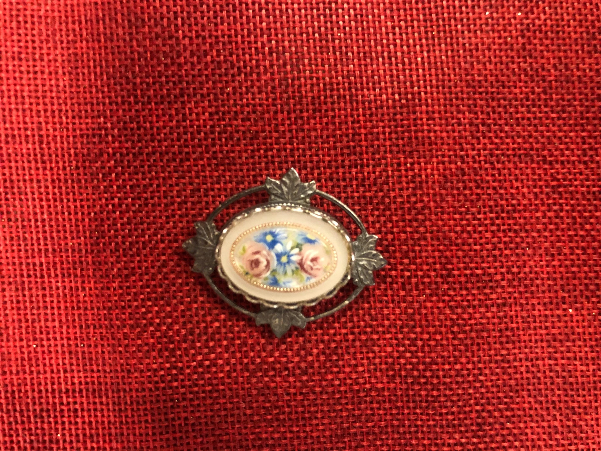 This classic and elegant pin has blue flowers and pink roses painted into the middle with a surrounding of silver leaves. A beautiful wedding gift or a classy addition to a mundane day.