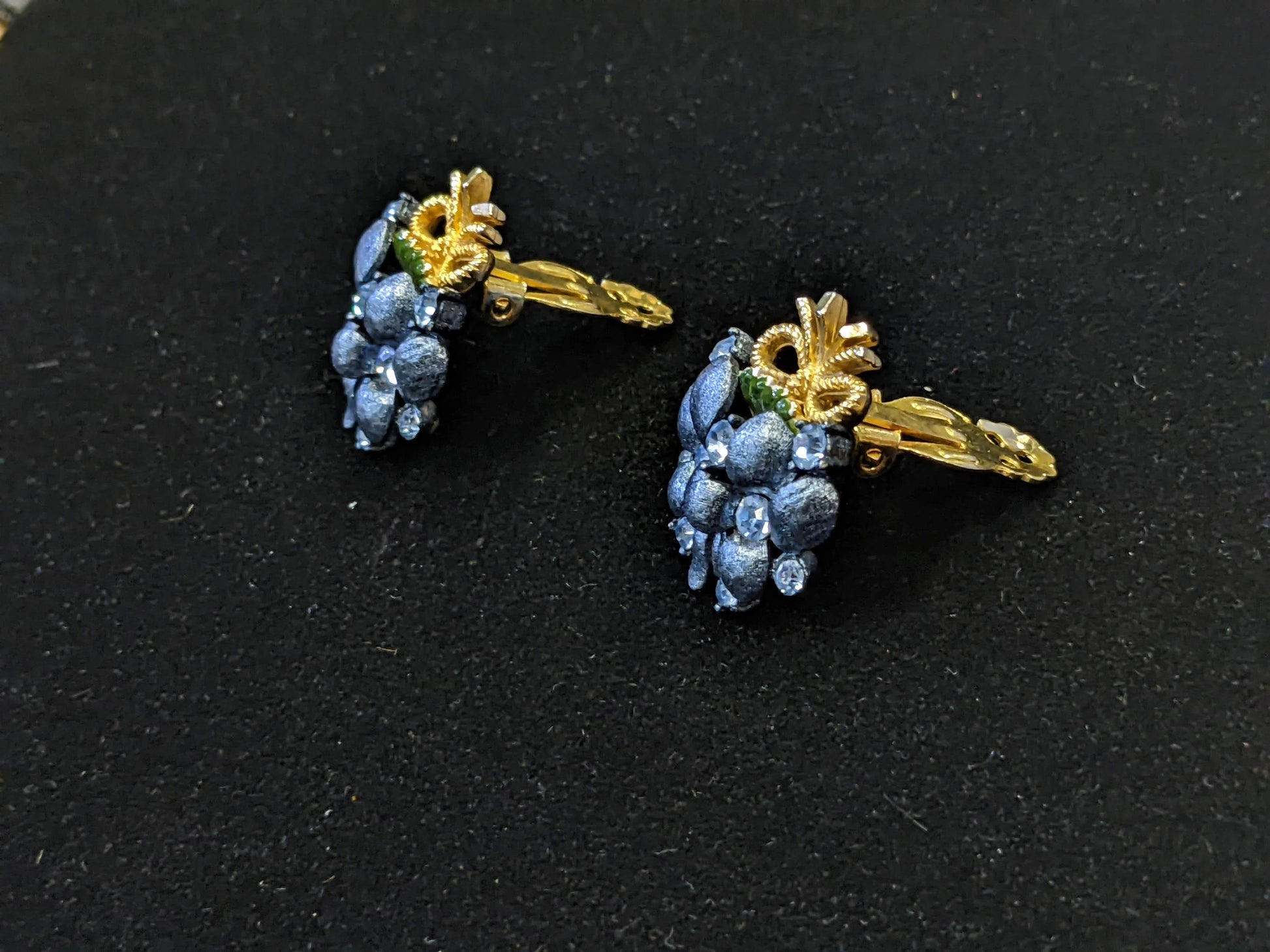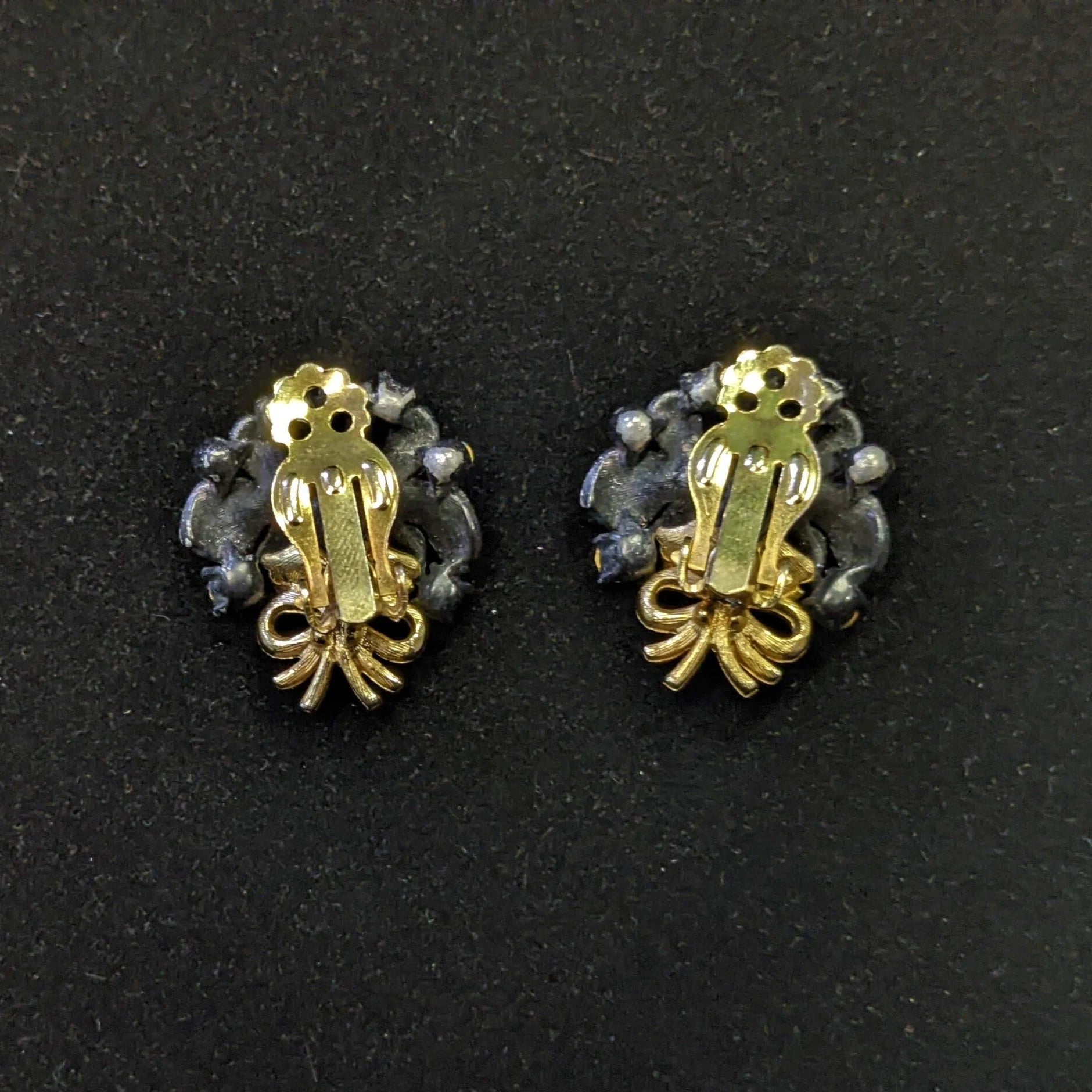 These Unique Vintage Clip Ons are lovely with smoky blue enameled metal flowers encrusted with a cornflower blue crystal and tied together at the bottom with a gold-toned metal bow. They truly make a statement.