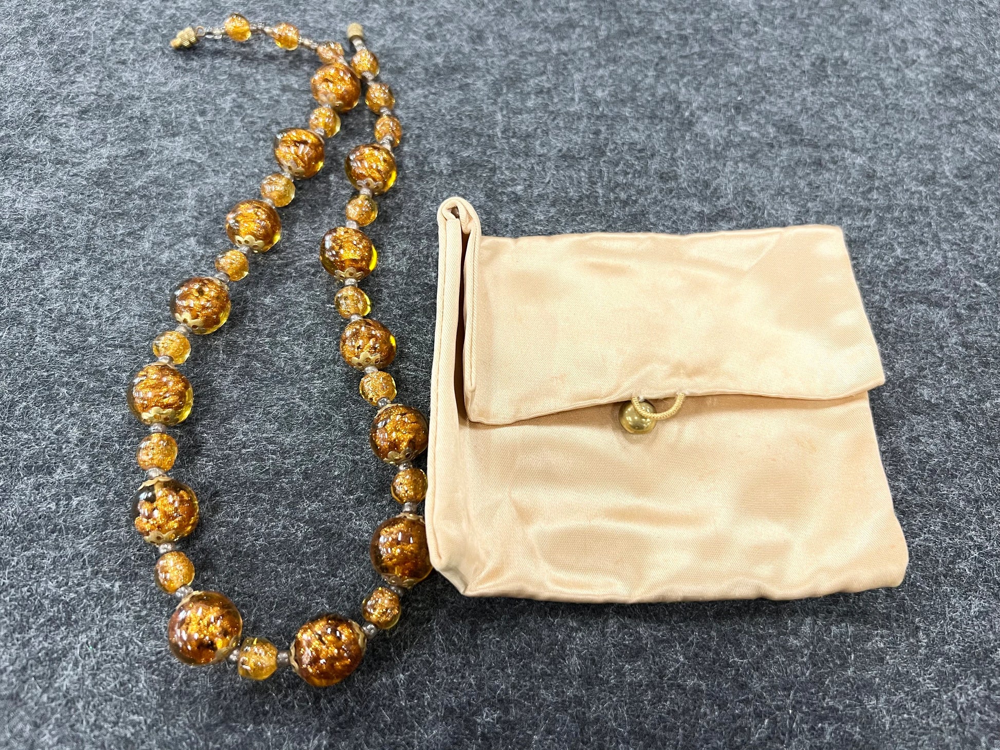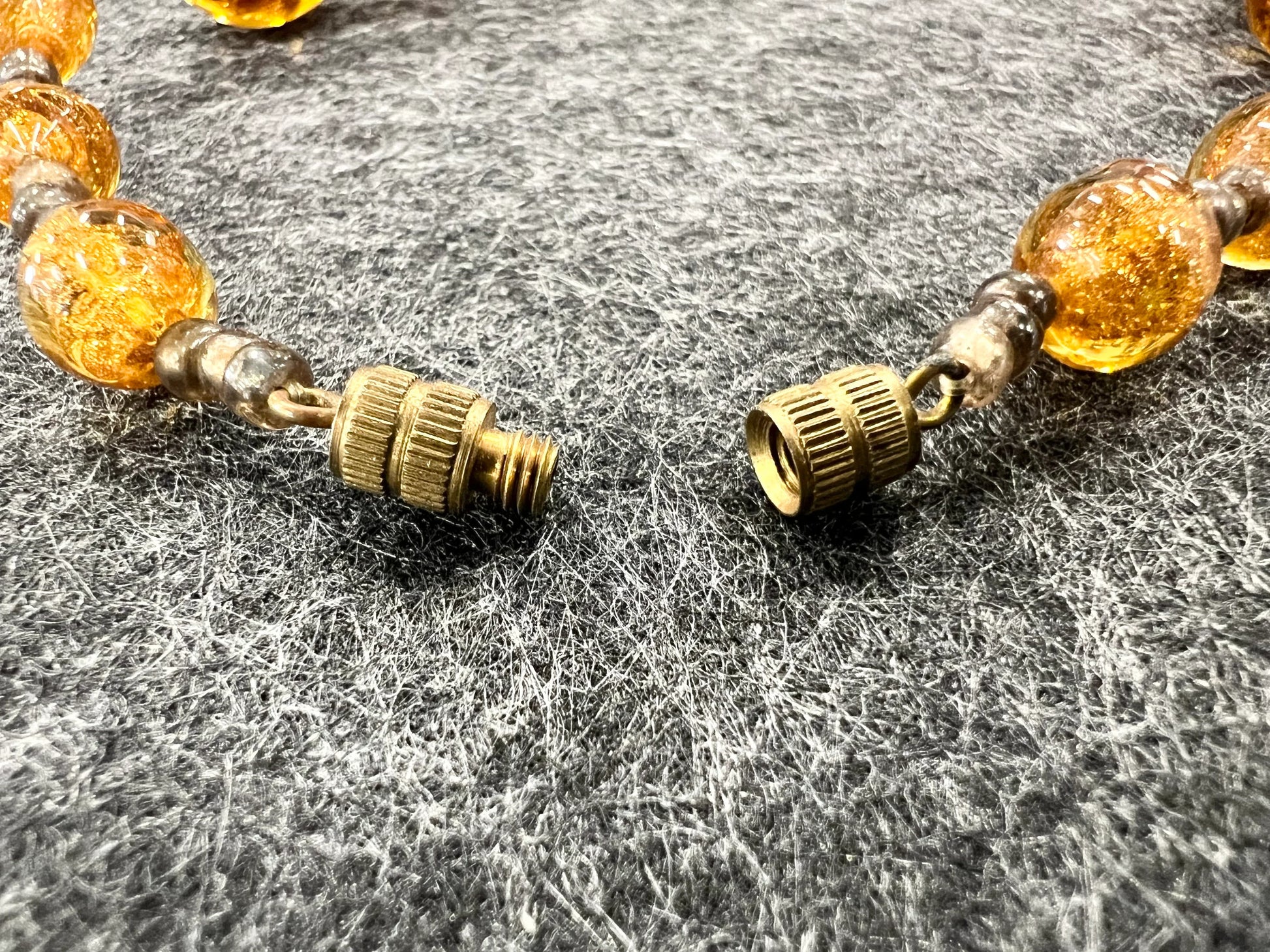 Sparkling Copper Murano Glass Necklace, which is made to be an adjustable Length Necklace. It works from choker to princess style. Actual specks of real Copper were infused into molten Honey-Colored Glass, then made into beads. This was a common practice when making beads which were going into mid century modern (MCM)Jewelry. MCM necklaces often had gold and silver in the beads. This necklace has .925 silver separators, whichcoud be cleaned further with toothpaste and a very soft tooth brush then rinsed and dried. Handle carefully, and the necklace will come alive with brightness.