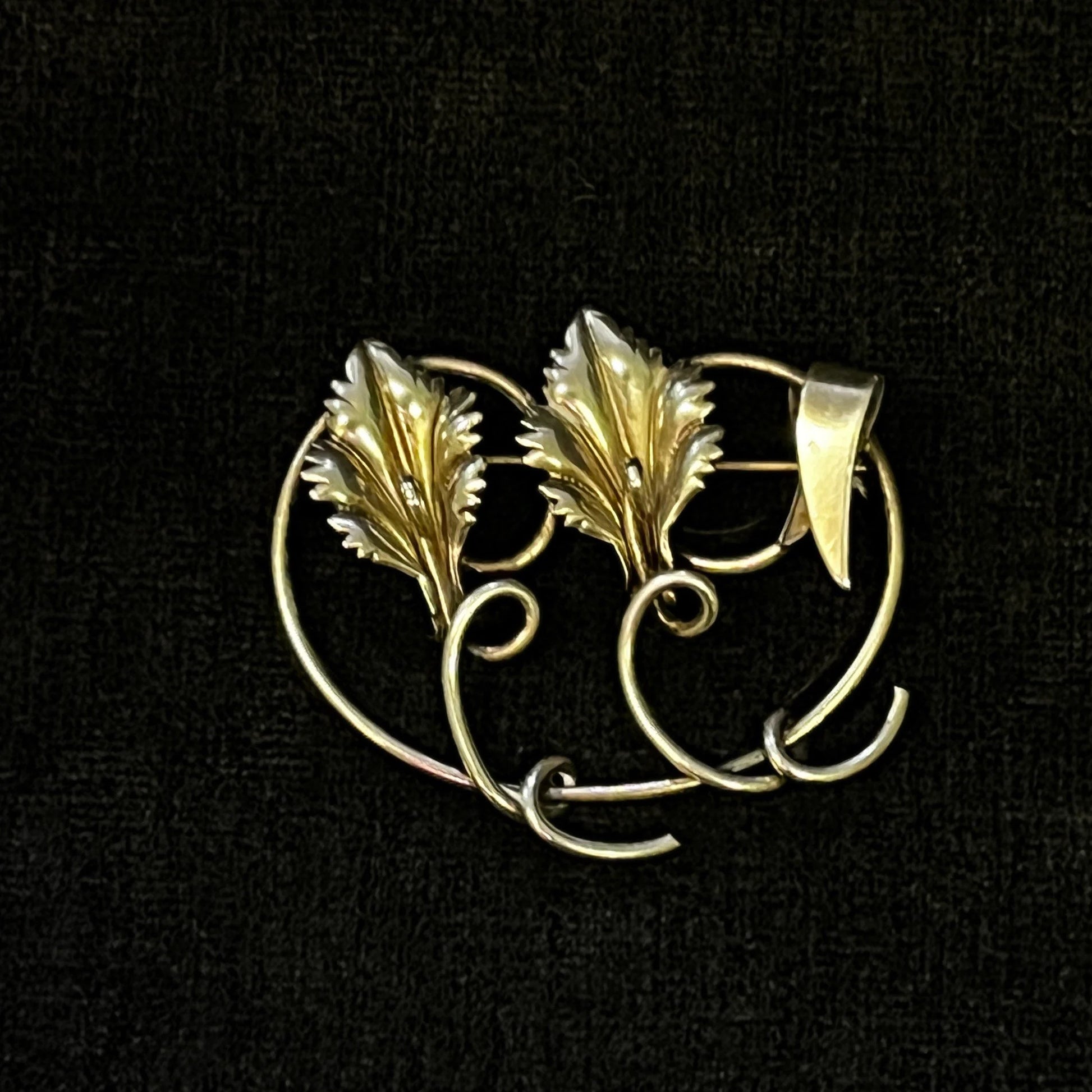 This sterling silver brooch is a vine figural with two leaves sprouting in the middle. The pin is a simplistic mid century design that begs for attention. Perfect for the spring weather or to pin onto a scarf for a wine tour, this piece is marked "Sterling". It would be very dapper on a boiled wool hat