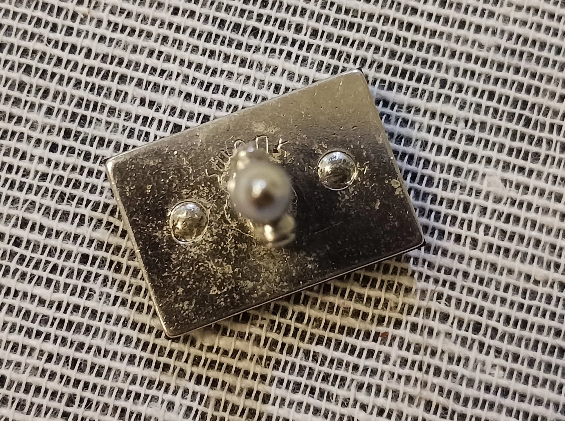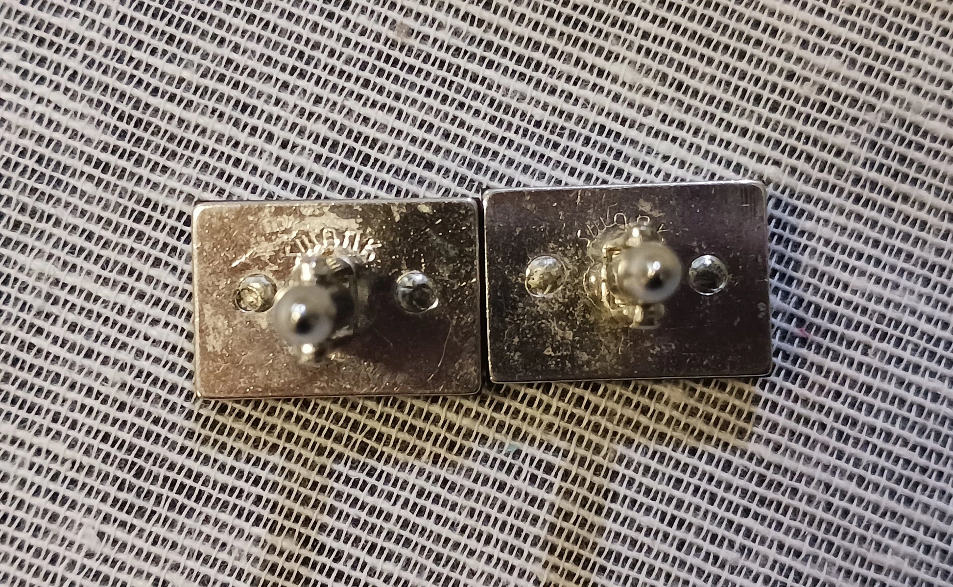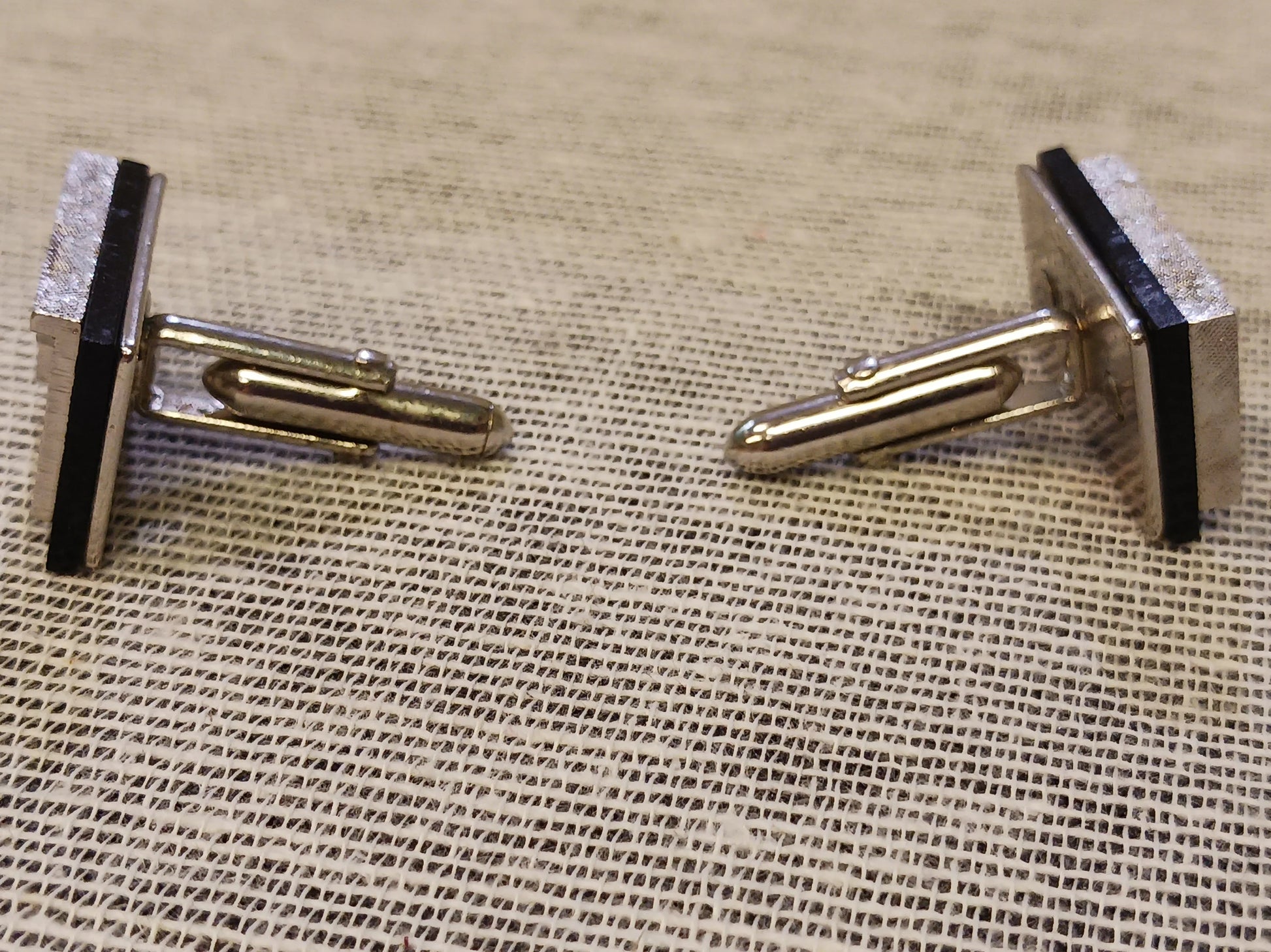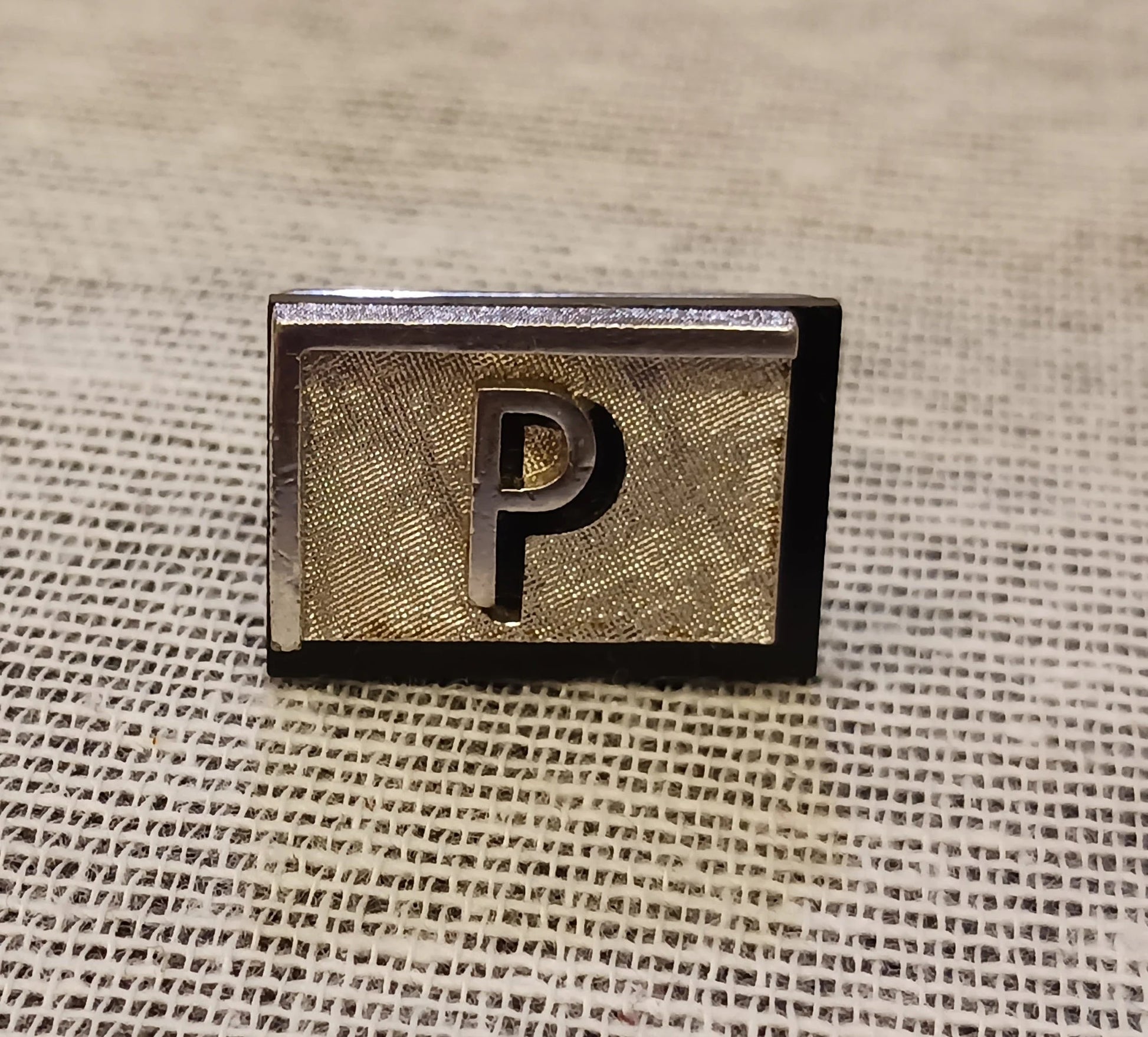 If you know someone with a name that starts with "P" who needs some nice cuff links, you're in luck! This listing is for a pair of signed, Swank brand monogram cuff links, adorned with a 3D letter "P." The design consists of a shiny metal base, a slab of black enamel, and another, angular metal piece that leaves a sliver of black beneath it. This optical illusion style was most prominently seen from this company during the 1970s and '80s, making these a fun blast from the past, as well as an intriguing addition to any suit cuff. Each cuff link face has a length just under one (1) inch, and is half an inch (0.5) wide. The size of the bar backing is a standard inch long when extended. The backs of both of them also bear the "Swank," brand mark. Given the age of these cuff links, it should be known that these show signs of wear. Namely, there is some discoloration to the metal, as well as some residue that can likely be cleaned off (see photos). Ultimately, these are in good condition and would make a great gift for yourself or someone else.