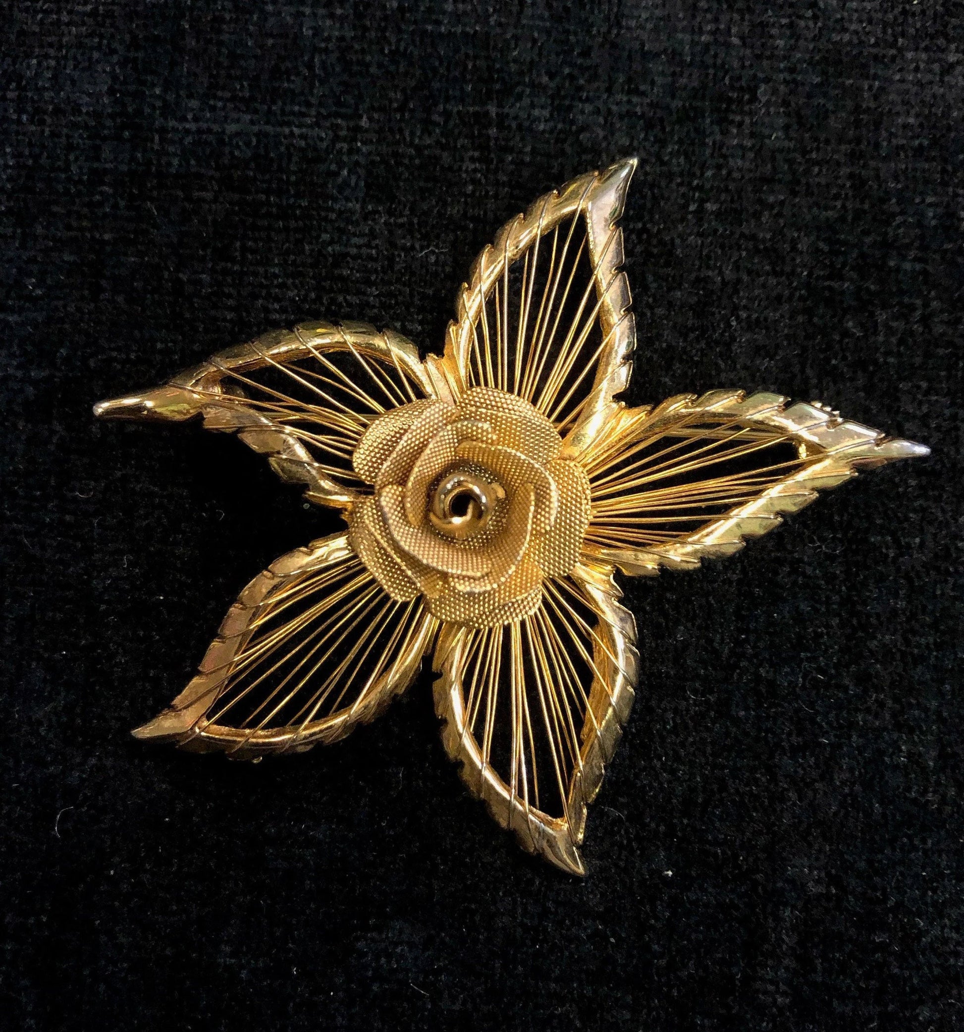 This spun wire gold tone Rose with leaves brooch would look lovely on a hat, scarf, or shirt! The brooch is in like new condition, see our photos. The pin is does not have a makers mark. The rose at the center of the piece is made up of fine metal mess petals. The inner part of the leaves have a wire pattern which goes from the rose to the border of the leaf, creating a natural veined look.