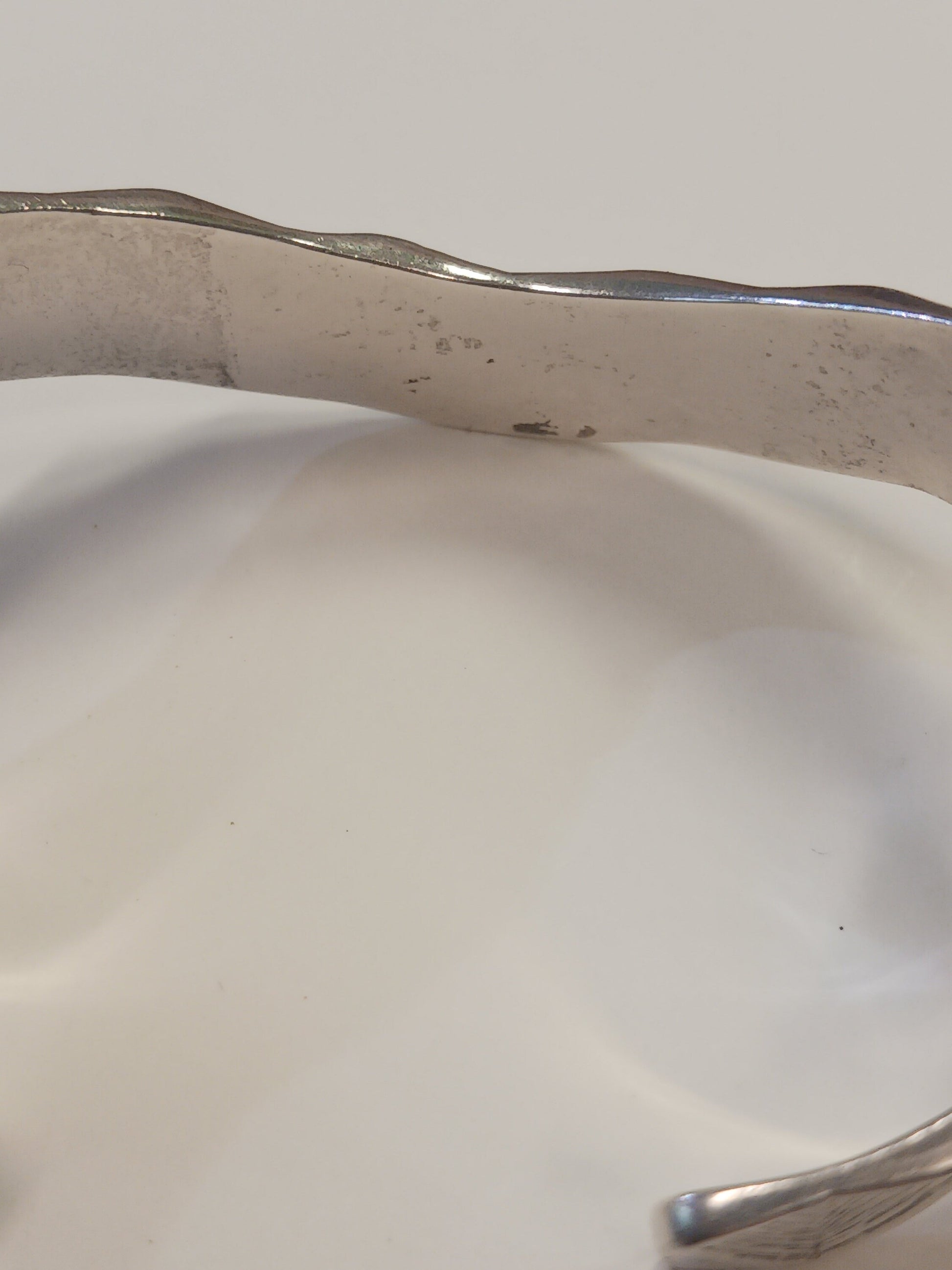 Do you know someone who loves a good geometric pattern? Consider gifting them this fine piece of signed, sterling silver jewelry. This intriguing cuff bracelet contains several engraved triangles in various sizes along a loose v-shape. The width of this bracelet is approximately 2.5in, making it the average size, but it could be loosened some with a gentle tug to each side. Along the inner left edge, the JA candelabra copyright is stamped in, along with, "STER," signifying its sterling silver composition. The bracelet is in overall great condition, with only some minimal discoloration along the inside (see photos). Otherwise, this bracelet is beautifully shiny and ready to be worn or gifted on day one.