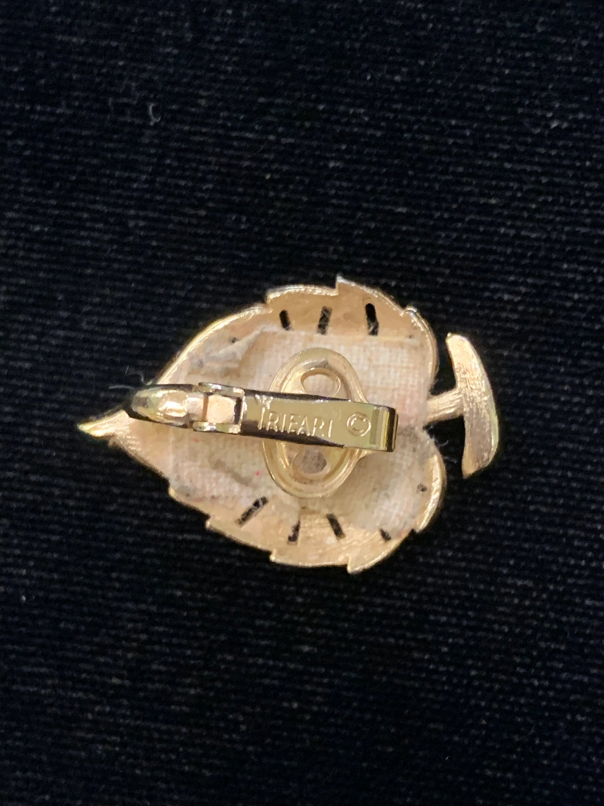 These gorgeous Trifari gold-toned leaf earrings are the perfect addition to your favorite outdoor walking outfit. The earrings are made of Trifanium, a material developed by the creator of Trifari, to give customers an affordable option for jewelry while maintaining the quality of luxury jewelry. They are in beutiful condition despite being nearly 40 years old. They are very collectible Trifari.