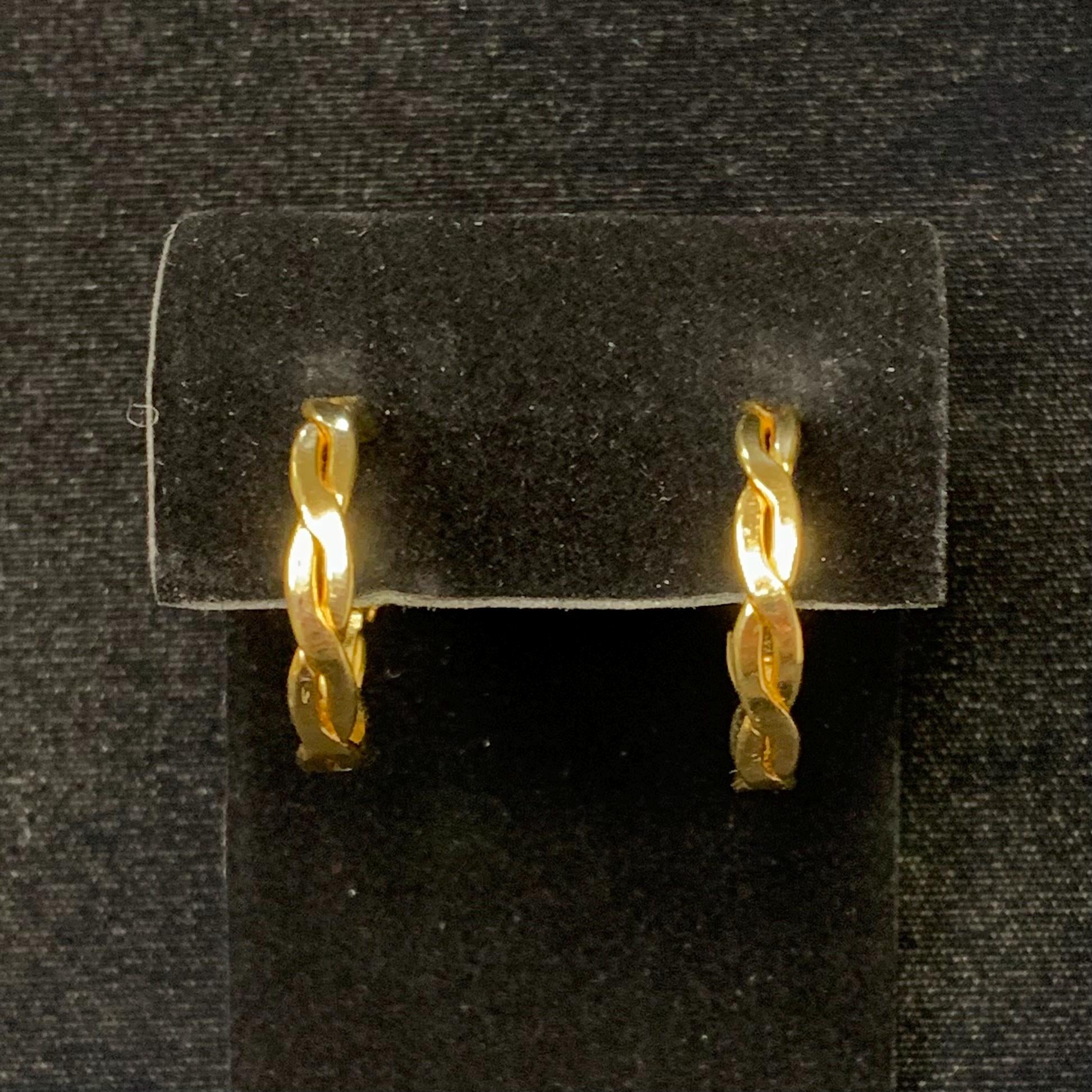 These earrings are perfect for everyday wear or adding some pizzazz to your favorite black dress. The twisted details of the hoops give an elegant touch to the simple piece. The earrings are in good condition with no visible marks or scratches. Price range: $15-20