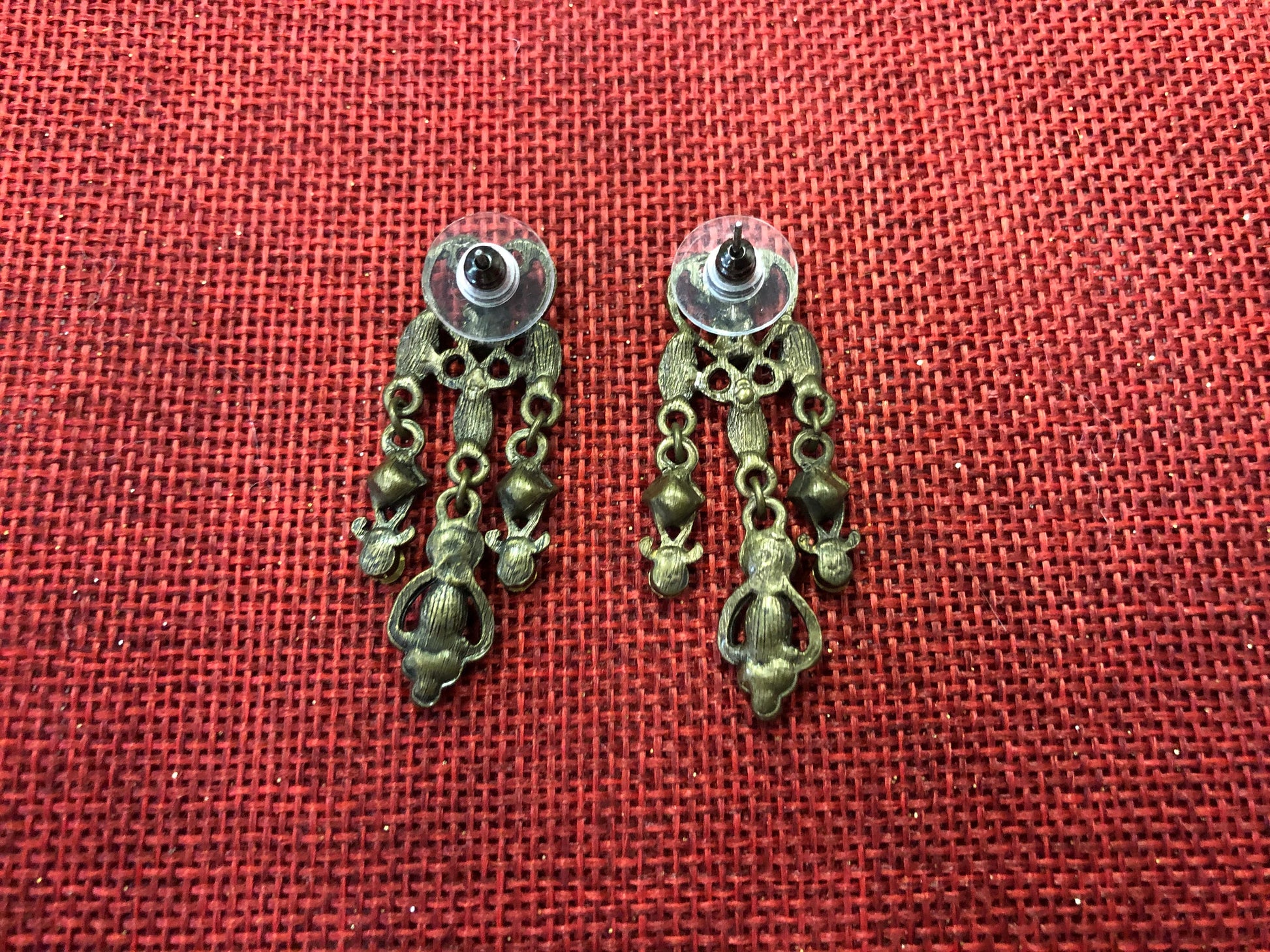 These elegant earrings have Emerald colored stones, dangling down below the stud. There are multiple colors of green on the earrings. They are a great addition to a vintage or modern look, and will call out for compliments on your night out, or if you choose emerald as your wedding color they would