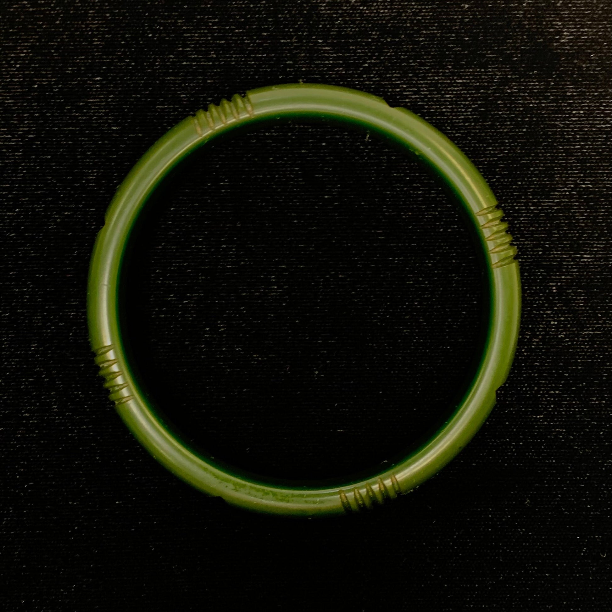 This bracelet is the perfect addition to your favorite green outfit. The carvings in the bracelet give it just enough detail to make it interesting, yet simple. The piece is in good condition with no visible marks or scratches.