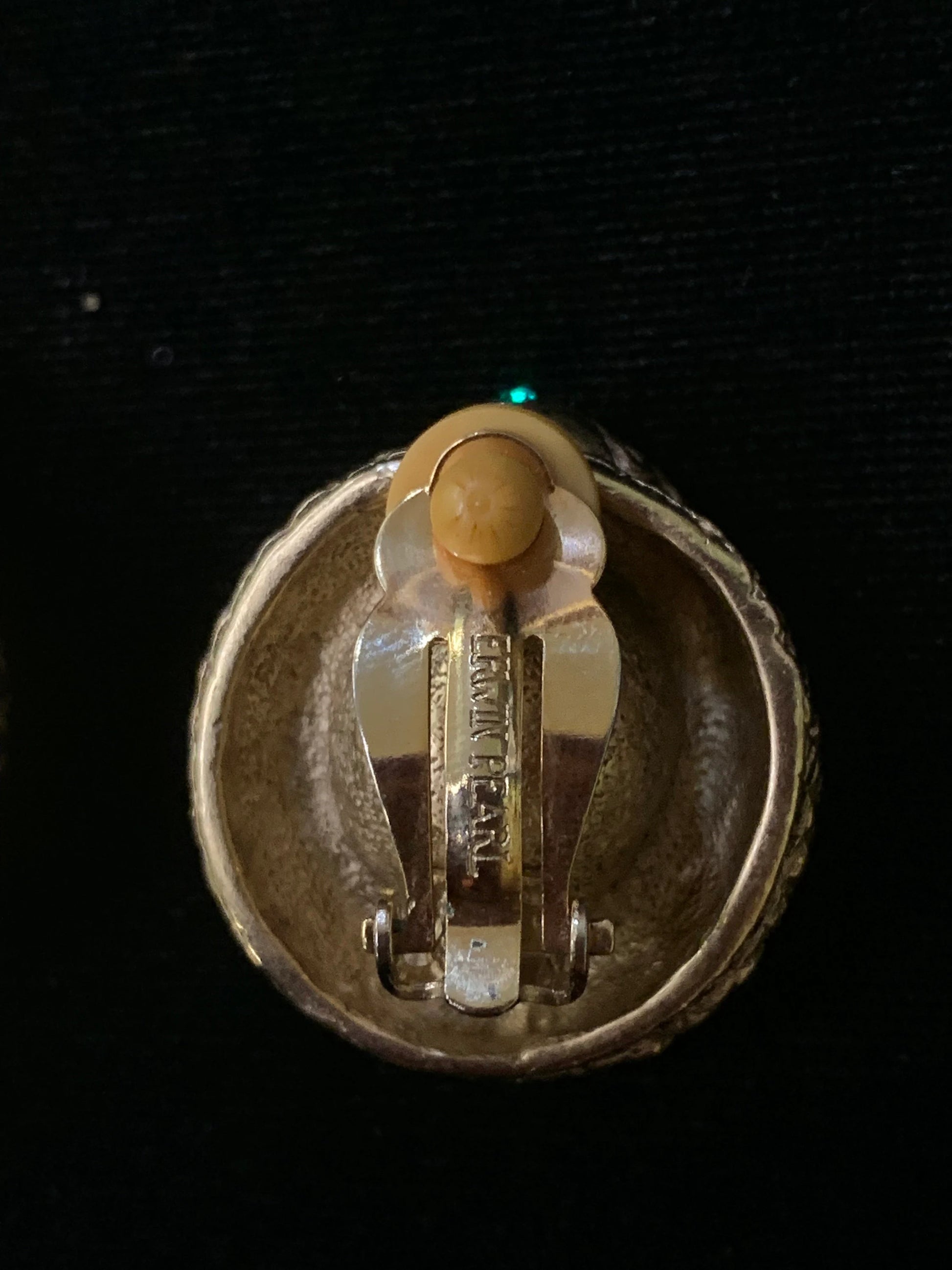 These vintage Erwin Pearl earrings are the perfect accessory to make your favorite emerald-green dress sparkle. The large pearl encompassed by the gold makes a bold statement. The emerald eyes add a subtle yet stunning pop of color.