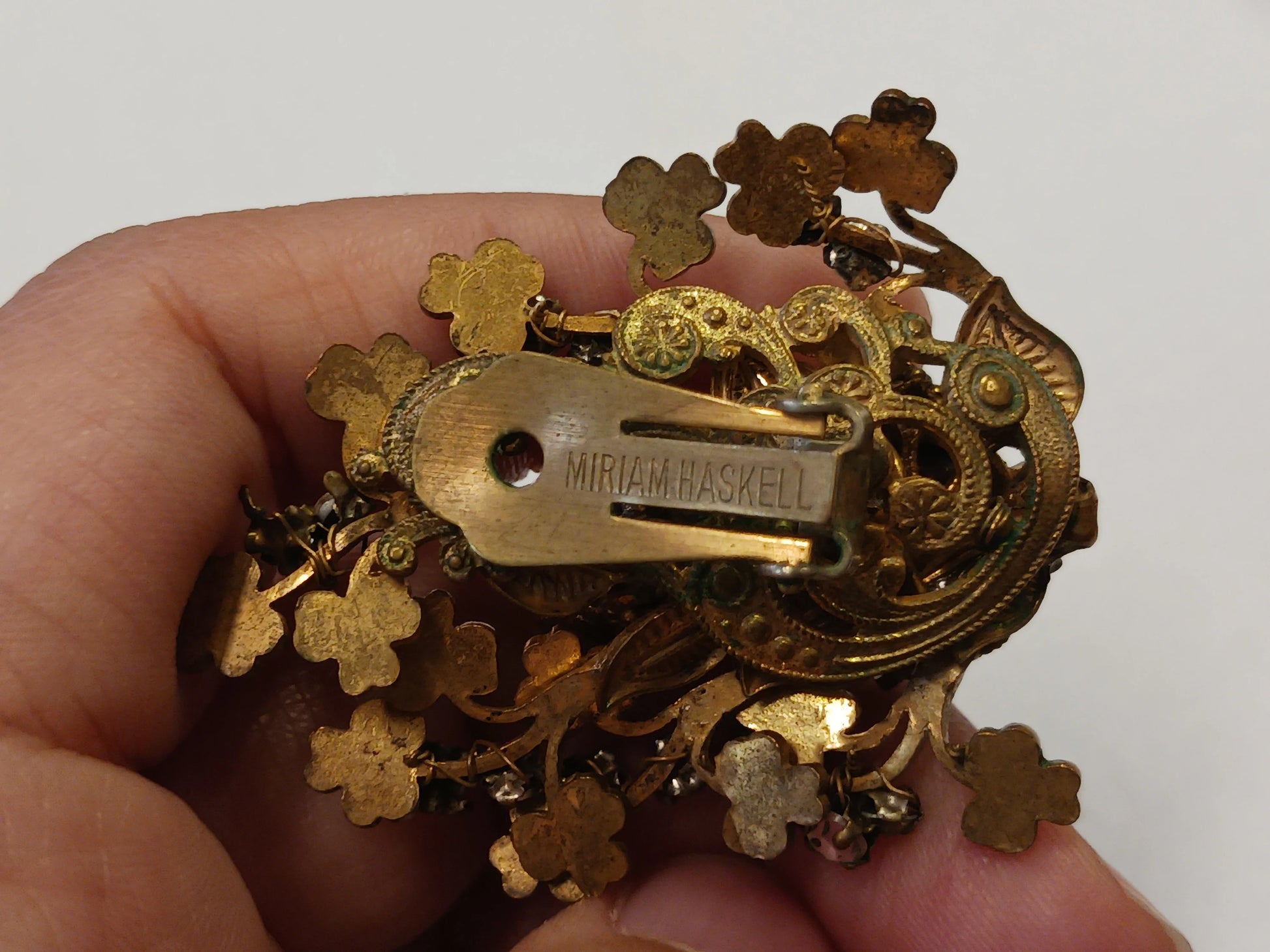 Listing is for a very rare find, indeed! For sale is a genuine signed brooch and earring set by Miriam Haskell. Brooch is composed of vintage 1950's brass with intricate wiring, faux pearls, and large rhinestone gems. Dimensions at 2.5in in length and height. The pin itself is in good working condition and item could be worn as is at time of purchase. Earrings are of similar composition with clip-on clasp backs - friendly for collectors with un-pierced ears! Set has notable imperfections due to its age. Namely, there are spots of tarnishing and discoloration, as well as a few loose parts/gems. Set is in good condition and can be cleaned up by buyer for wear or display at their discretion!