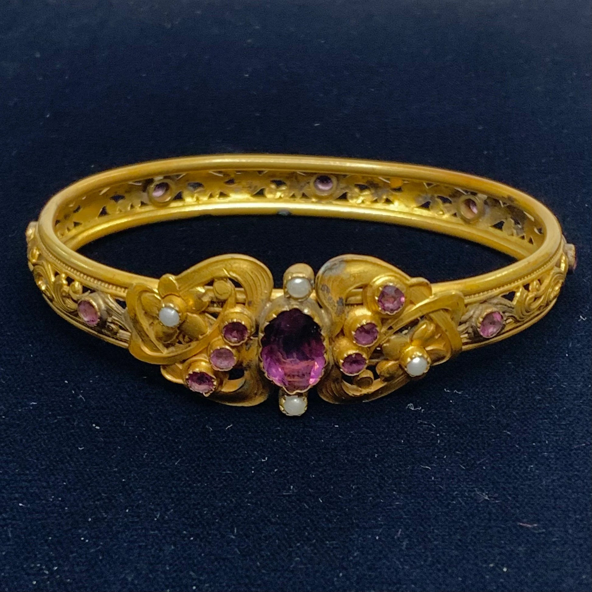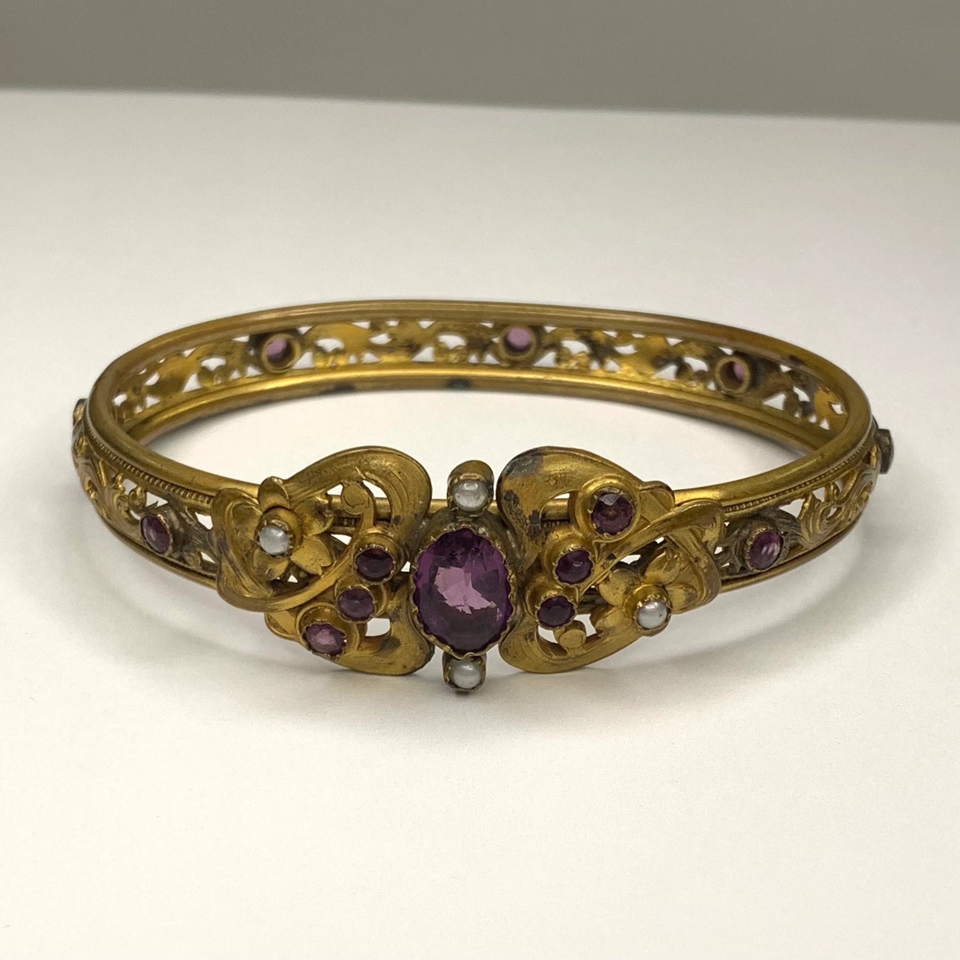 Vintage Victorian Purple Rhinestone and Pearl Bangle Bracelet Set in Gold Tone