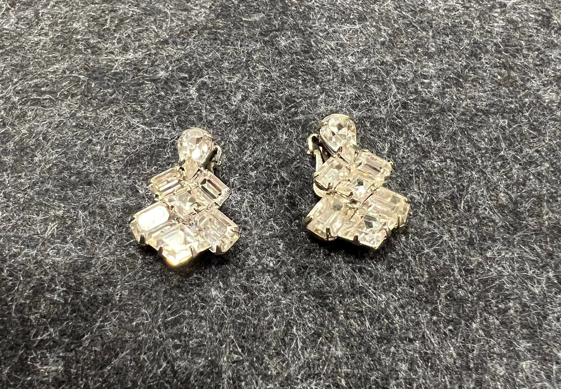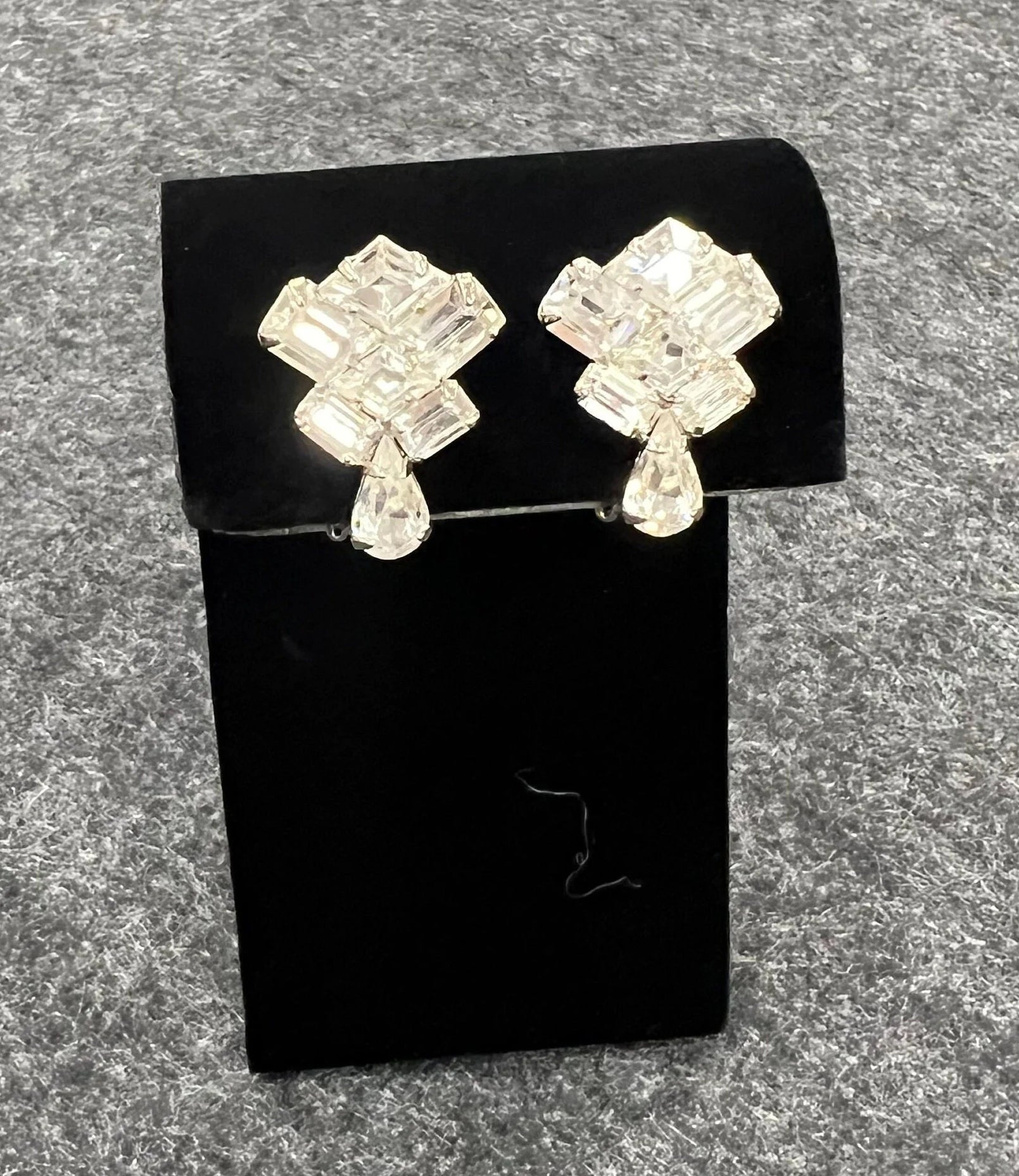 Gorgeous Crystal Clear and Super Sparkly Weiss jewelry. These beautifully cut Austrian crystal earrings would be perfect for a bride. They are timeless and in great condition. Made up of crystals cut as beveled baguettes and a pear shaped teardrop, definitely stunning. The clip-on back works well, very light and wearable. They are signed WEISS, a famous designer from the mid century.