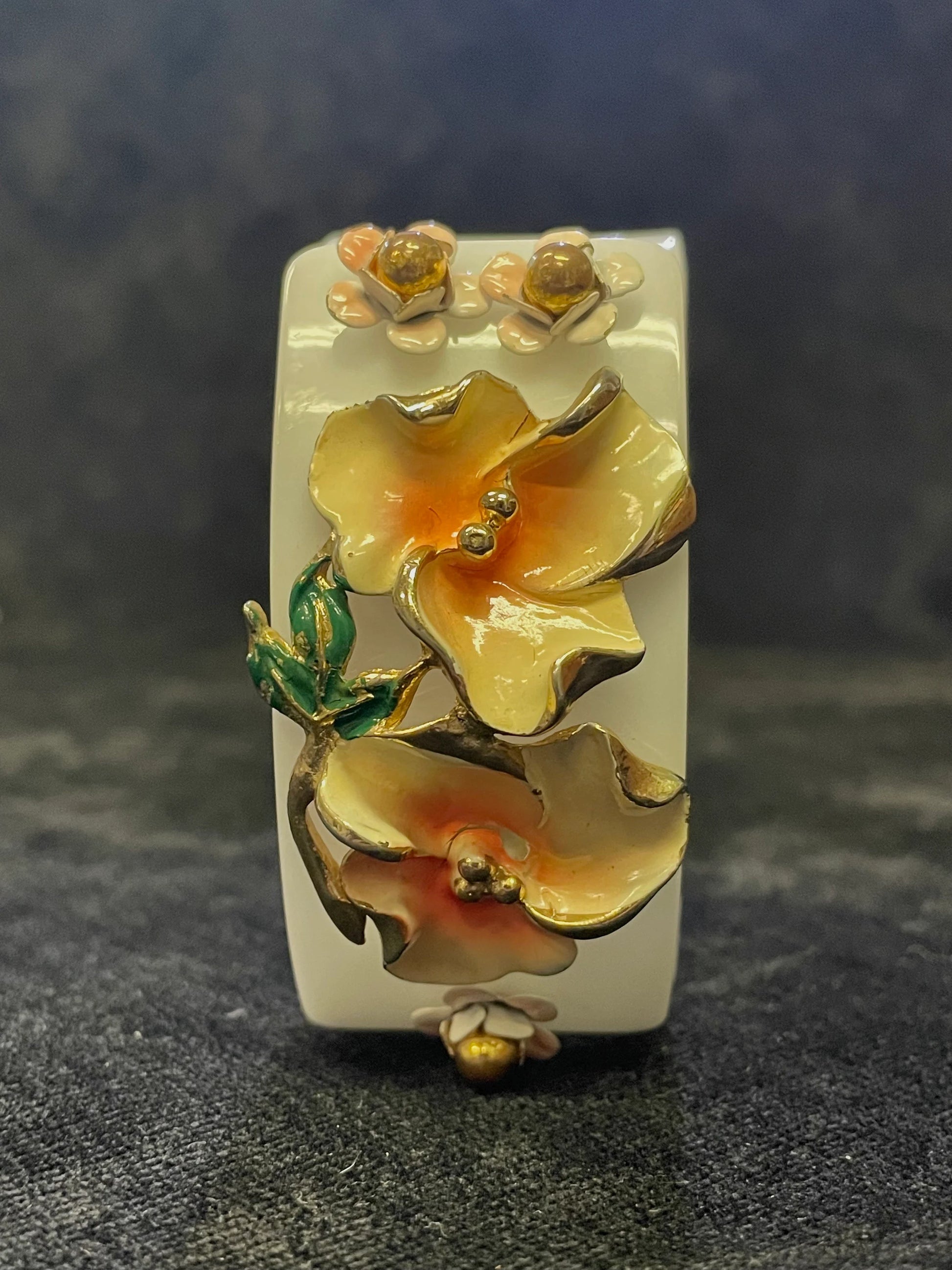 This wonderful hinged white lucite flower "corsage" style bracelet is a perfect piece! The bracelet is topped with peachy yellow metal flowers, likely done in a cold enamel. The paint on the cold enamel is very delicate, and as pictured there are some tiny fissures in the paint, only noticeable on very close inspection. The bracelet is lovely.