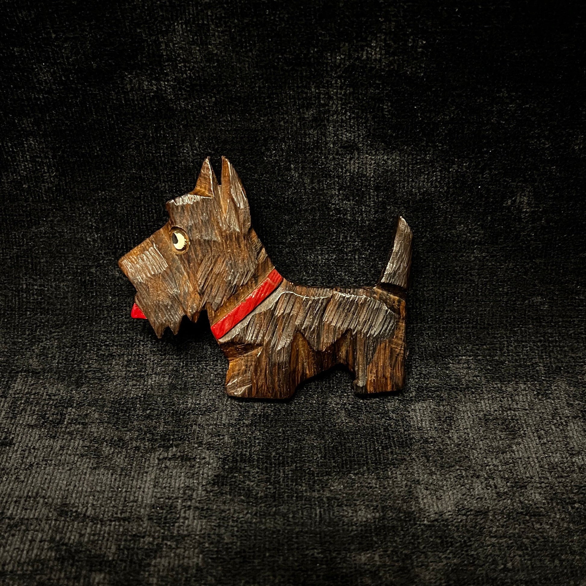 President Franklin D. Roosevelt, famously loved his little Scottish Terrier, named Fala, and America fell in love with this little dog. There were literally hundreds of pieces of jewelry made in his image. This listing is for a hand carved wooden pin/brooch of an adorable Scottish Terrier which will trot away with your heart. Painted to have a red collar and its tongue hanging, this terrier is a dark brown stained wood. The carved wood gives the texture of a dog's coat and would look great on your coat, scarf or hat!