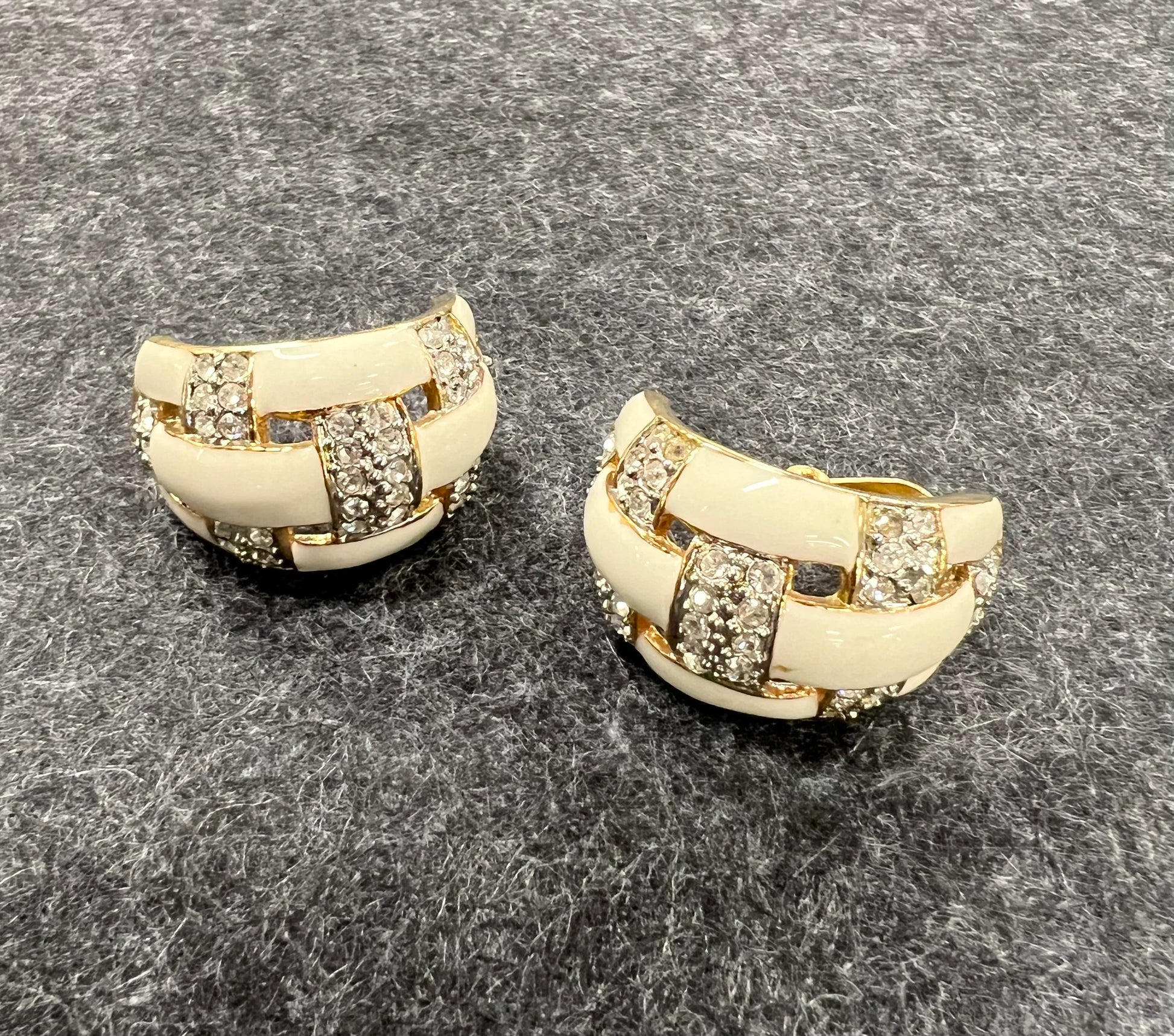 Woven C-Hoop Earrings - Crystal and Ivory Enamel - Gold Toned Metal - Vintage Clip Ons