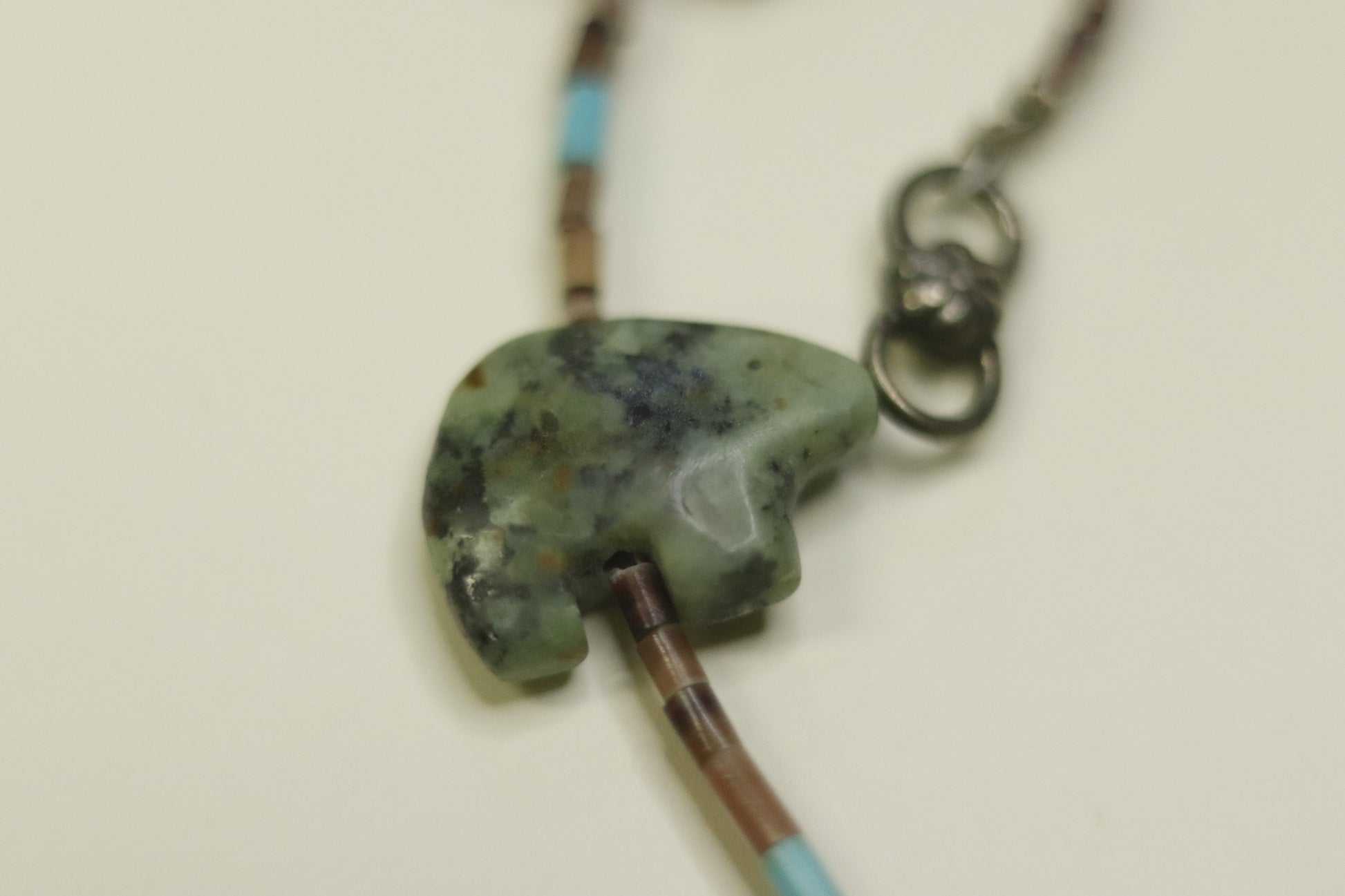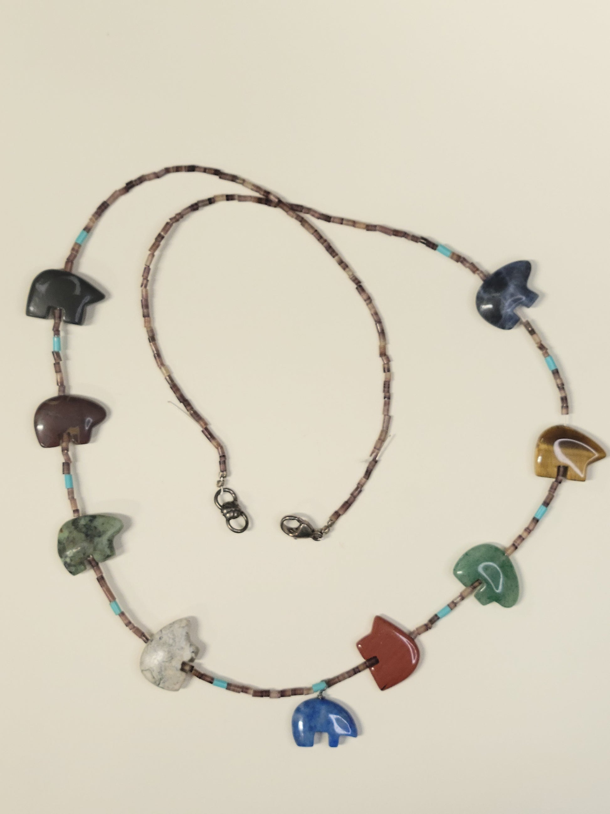 This vintage necklace is a unique find from the Zuni tribe of New Mexico. It was originally obtained in the 1930s as trade jewelry, most likely purchased by a tourist, at a Trading Post, where local artists sold their handmade items. It has 9 hand-carved bears made of different semi-precious stones and has tiny hand made beads interspersed on the necklace. The stones usually were from the area of the Reservation. Some are turquoise and coral.